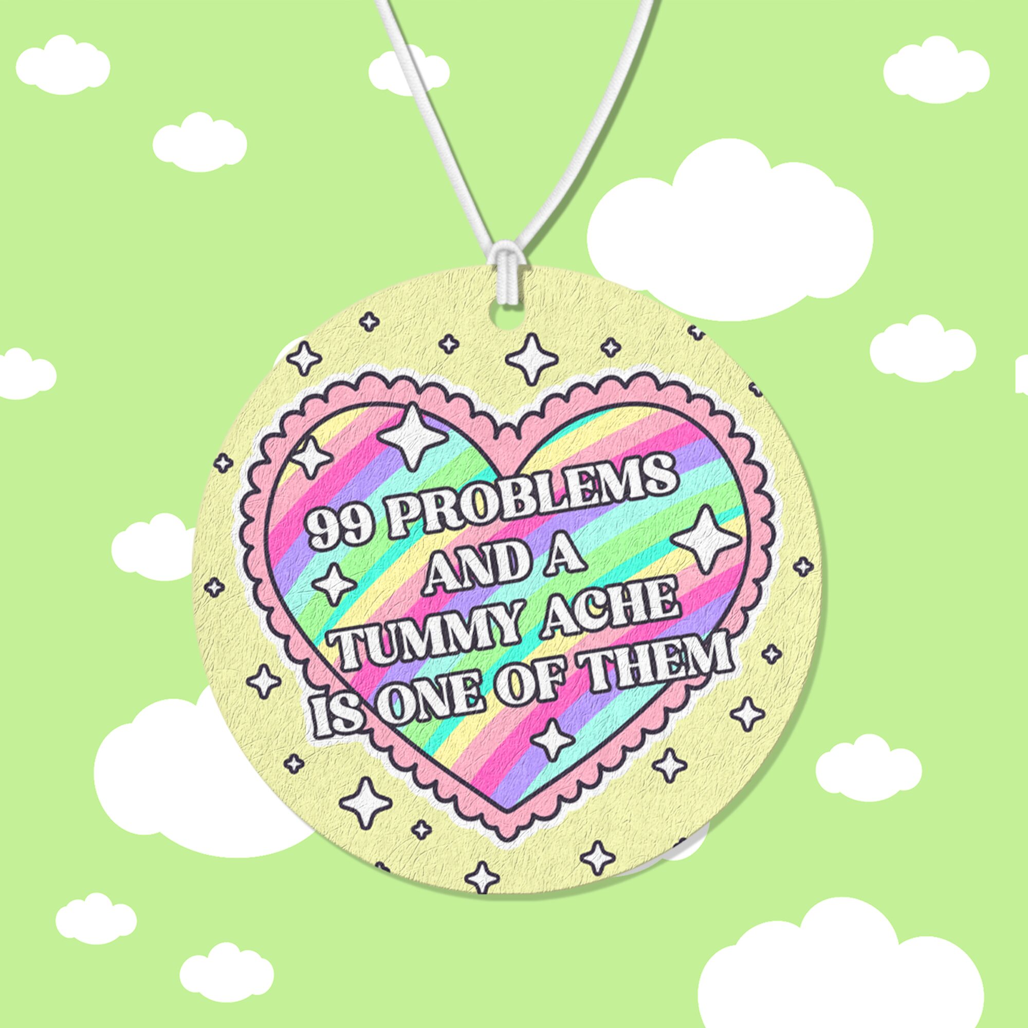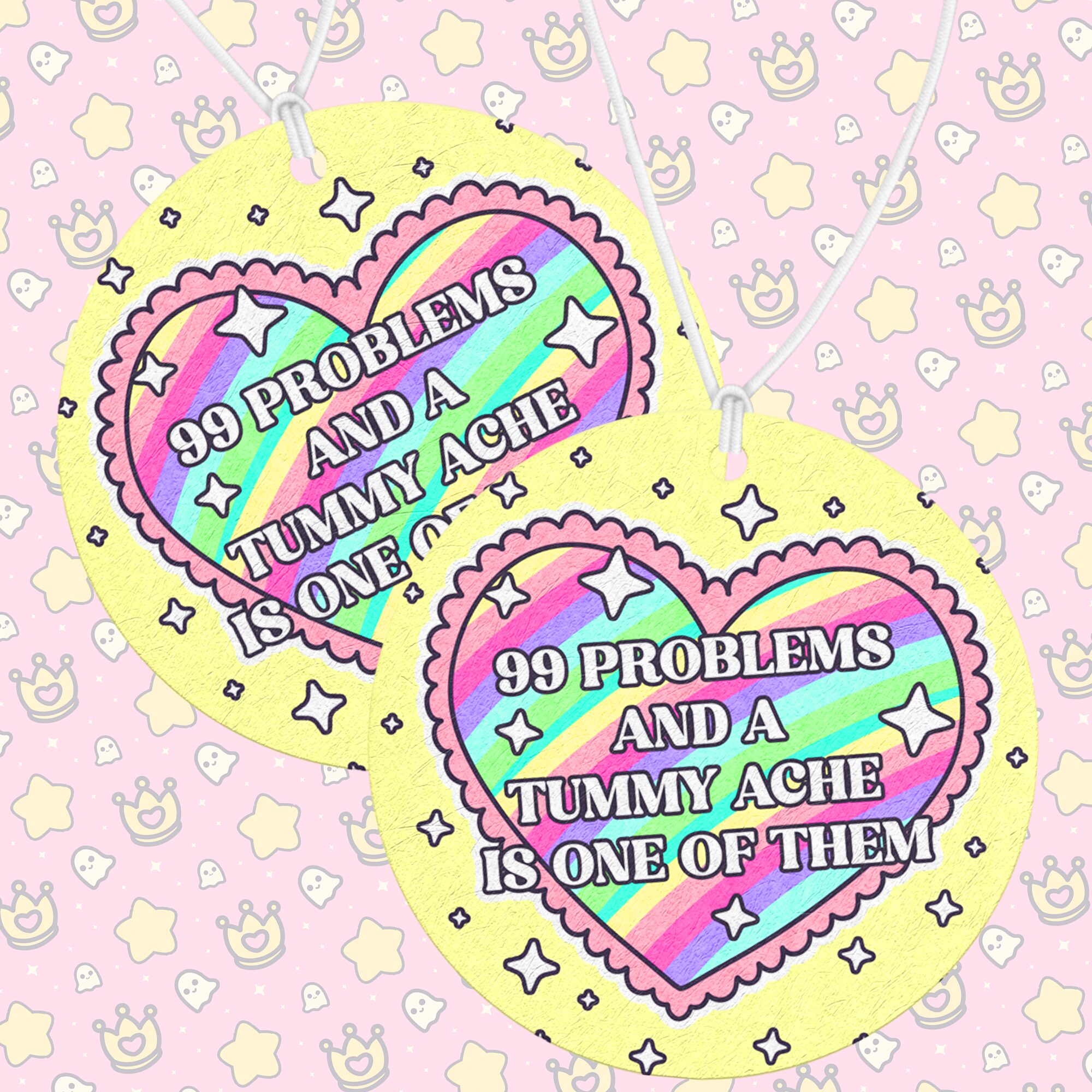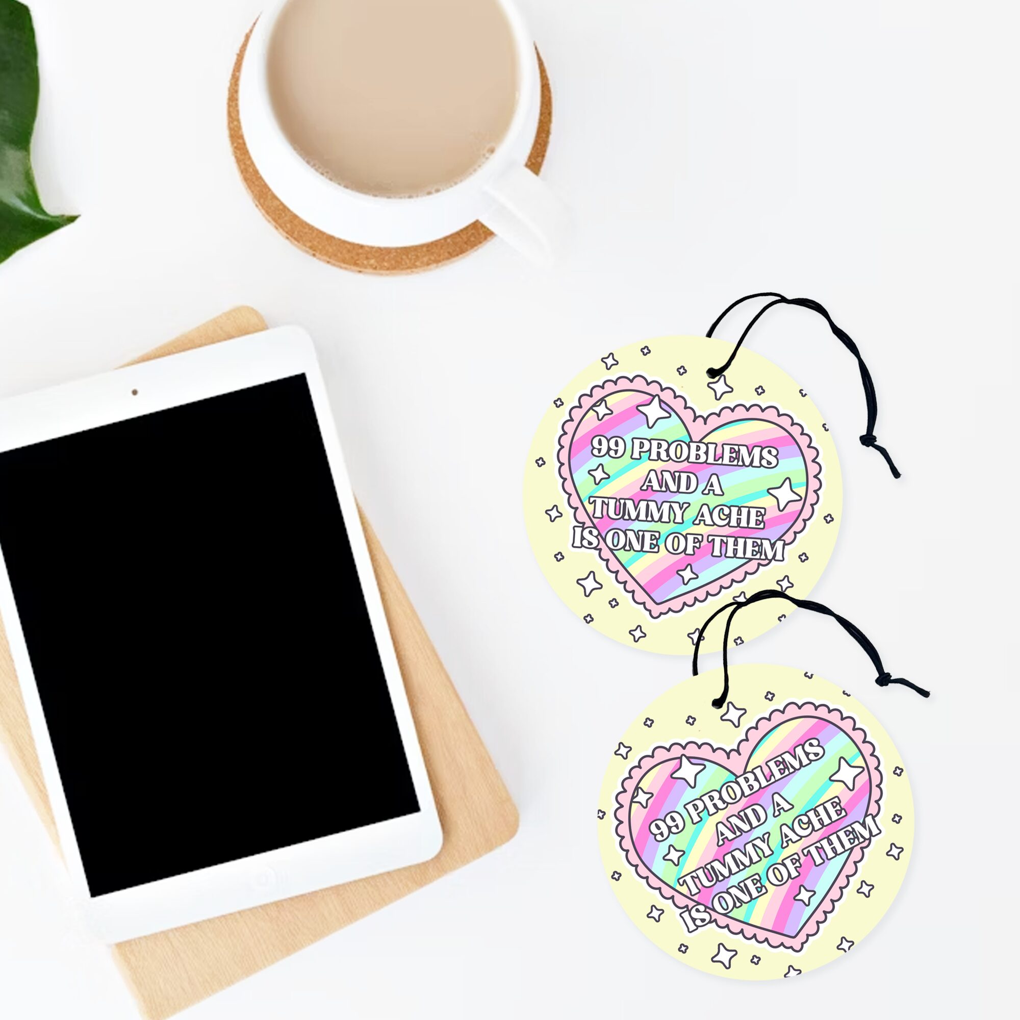 Brighten up your car, bedroom, or workspace with a little humor and a lot of charm with the “99 Problems Air Freshener.” This double-sided air freshener features a cute heart design with the playful phrase, “99 problems and a tummy ache is one of them,” set against a cheerful yellow background. Its whimsical artwork captures the essence of Lil Charmery’s unique style, adding a touch of personality and laughter wherever it hangs. 💛