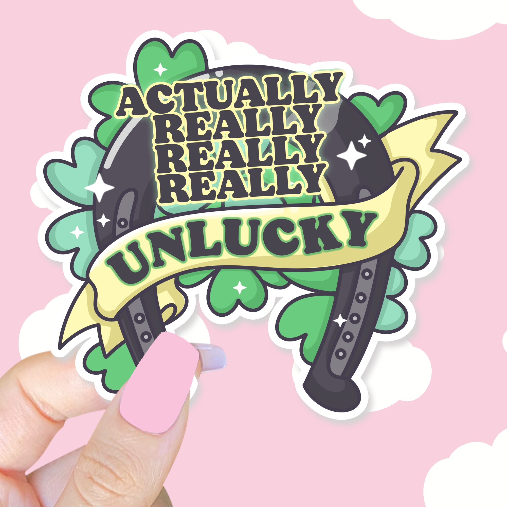 Introducing the “Actually Really Unlucky Sticker” from Lil Charmery, where cuteness and humor collide in a unique and cheeky design. If you’re someone who embraces the quirks of life and doesn’t mind a little bad luck now and then, this sticker is perfect for you! Featuring an adorable yet sassy design of an upside-down horseshoe—the universal symbol of bad luck—with the playful phrase “Actually Really Really Really Unlucky” prominently displayed, this sticker adds a dose of humor and charm wherever you choose to stick it.