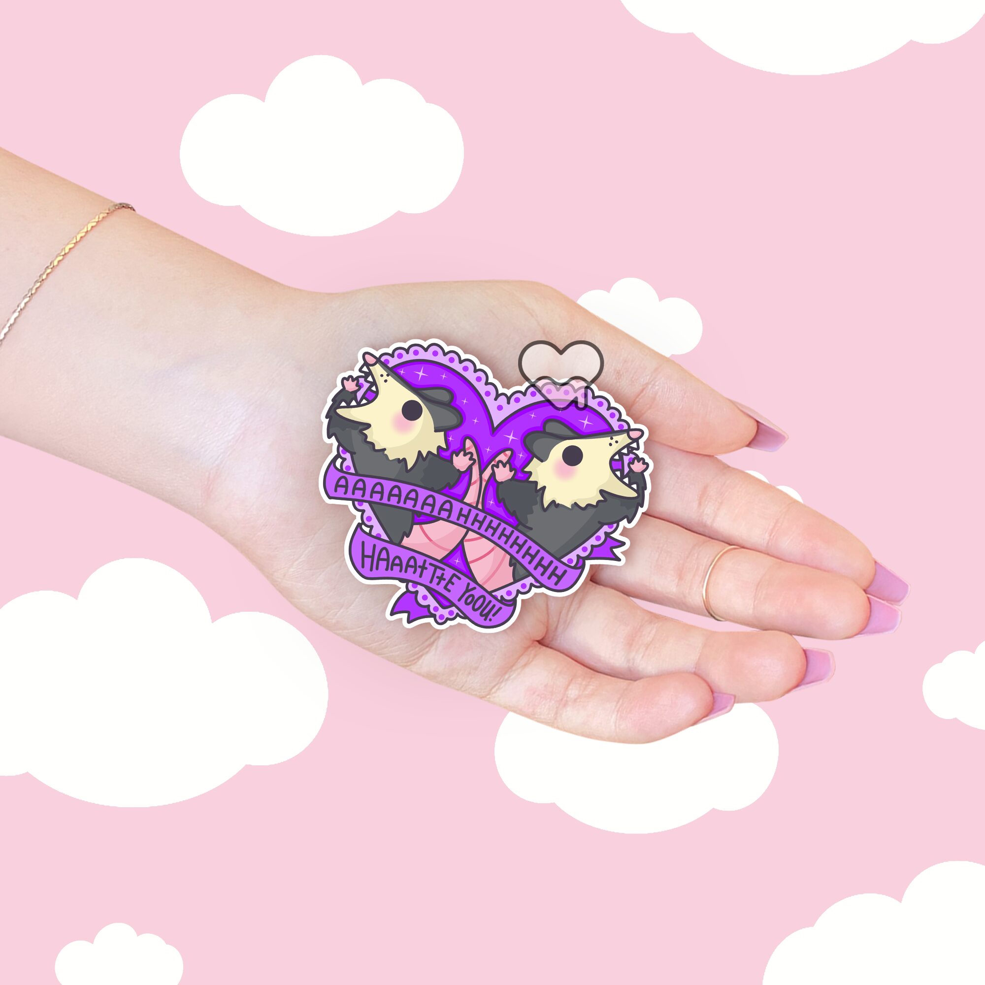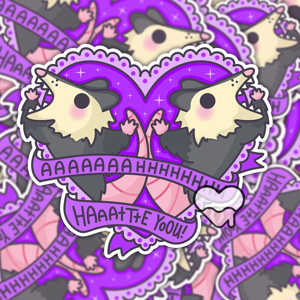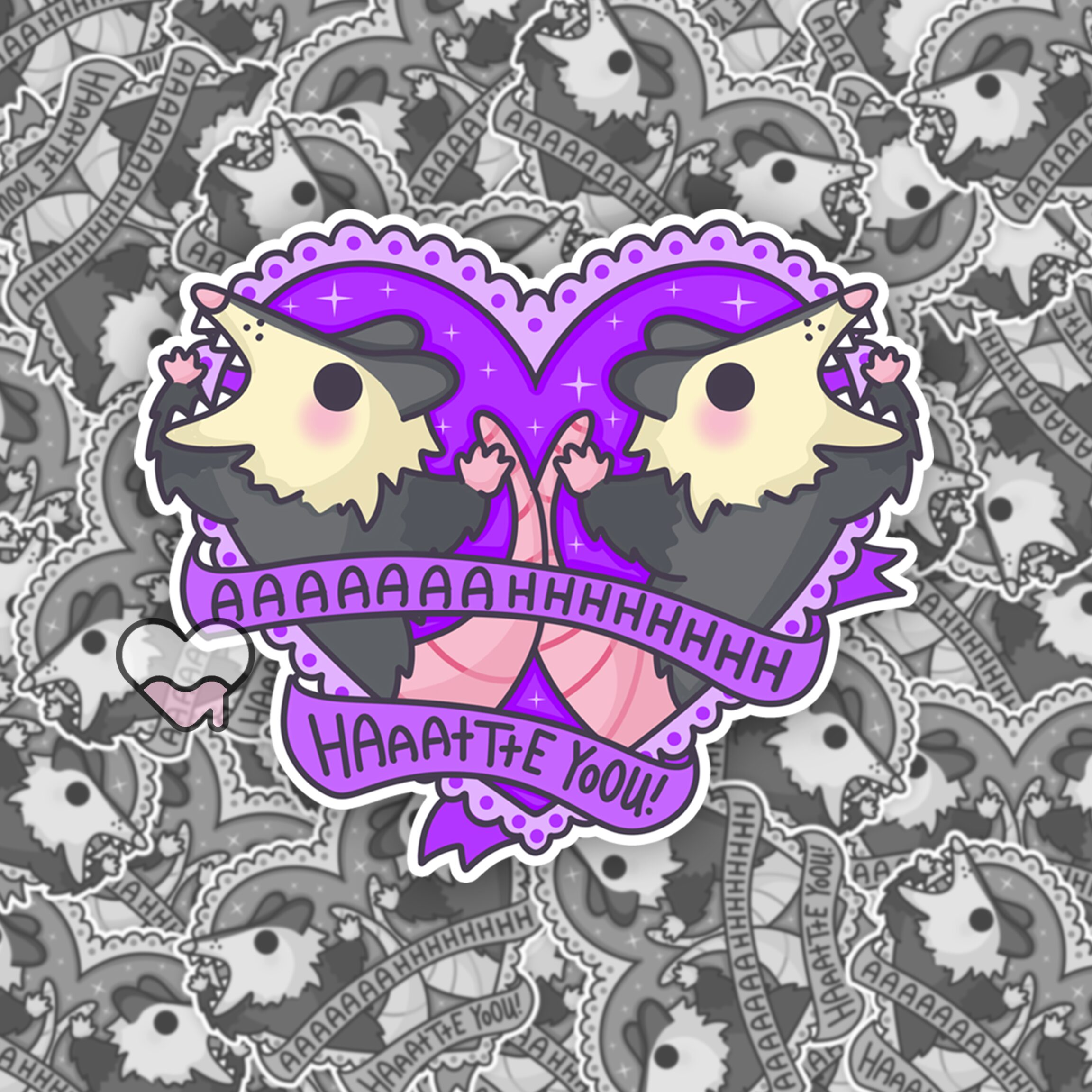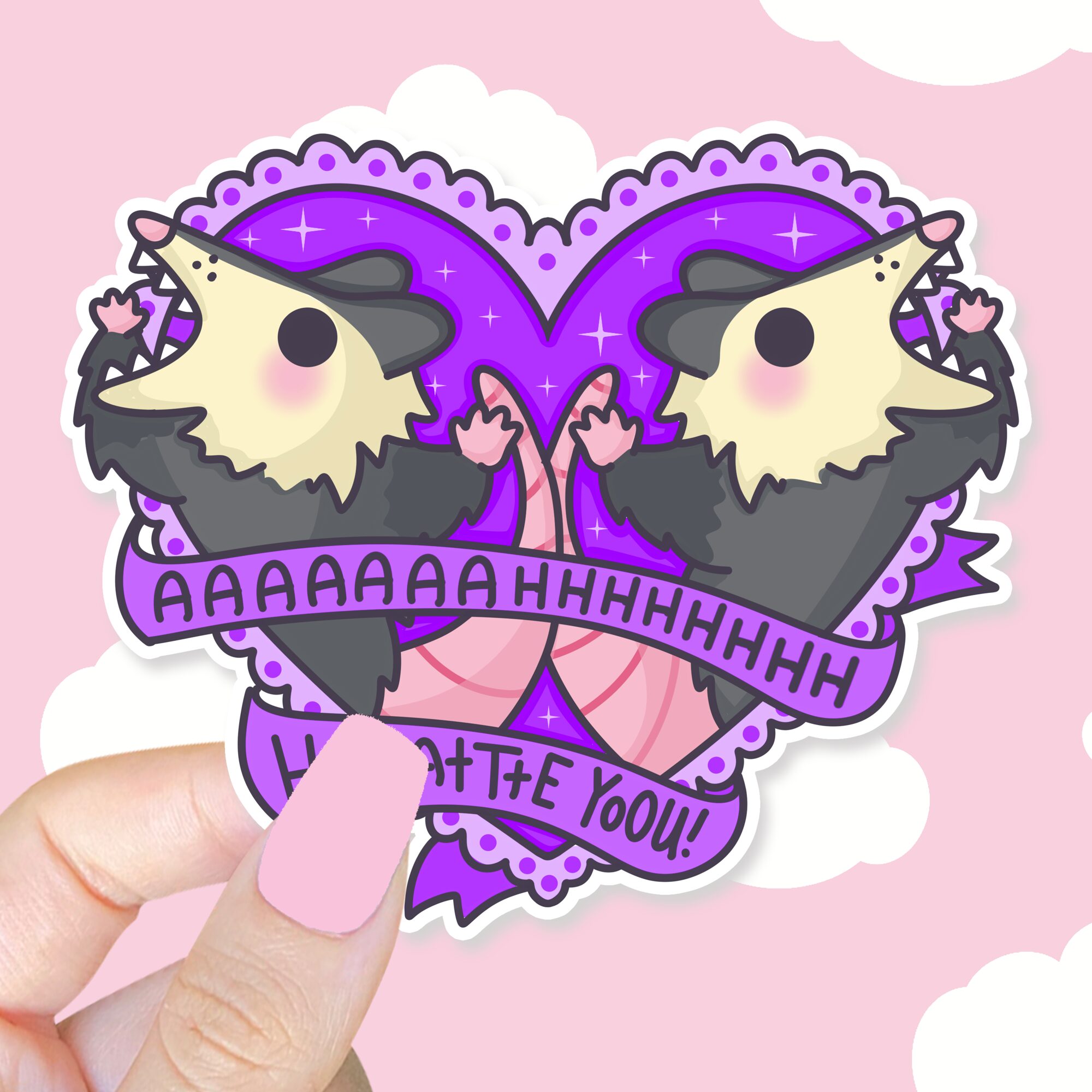 Introducing the “Ahh Hate You Possum Sticker” from Lil Charmery—an irresistibly cheeky design for those who appreciate a touch of sass with their cuteness. Featuring two adorable, wide-eyed screaming possums, this sticker is a hilarious and expressive way to let the world know when you’re feeling a little less than fond of something or someone. With the bold phrase “Ahh I Hate You” scrawled across the design, it strikes the perfect balance between humor and attitude, making it an excellent addition for anyone who loves playful, yet snarky, artwork.