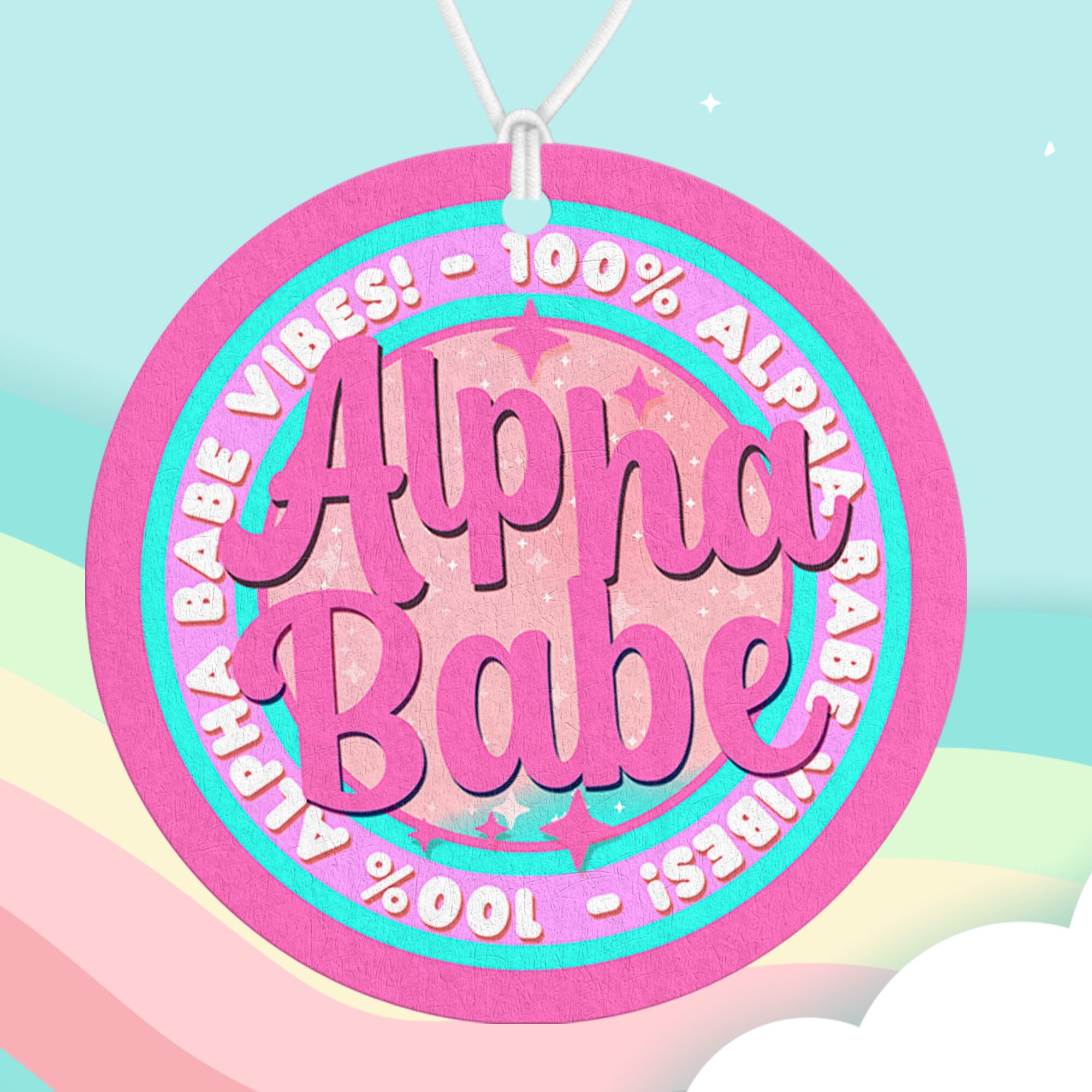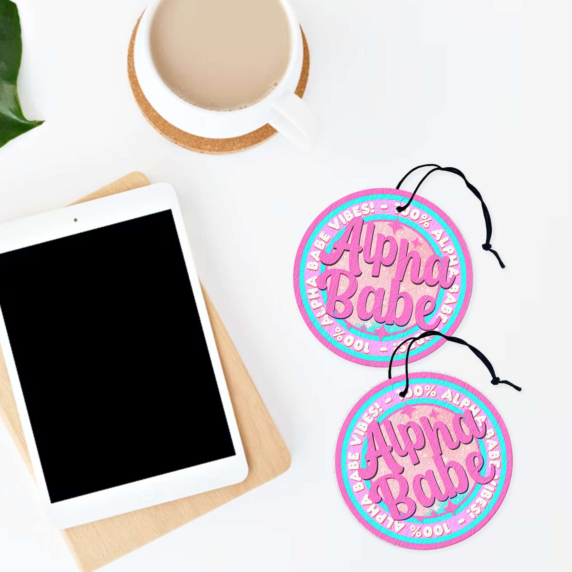 This double-sided air freshener features the empowering phrase “Alpha Babe, 100% Alpha Vibes” set against a vibrant pink background, radiates confidence!