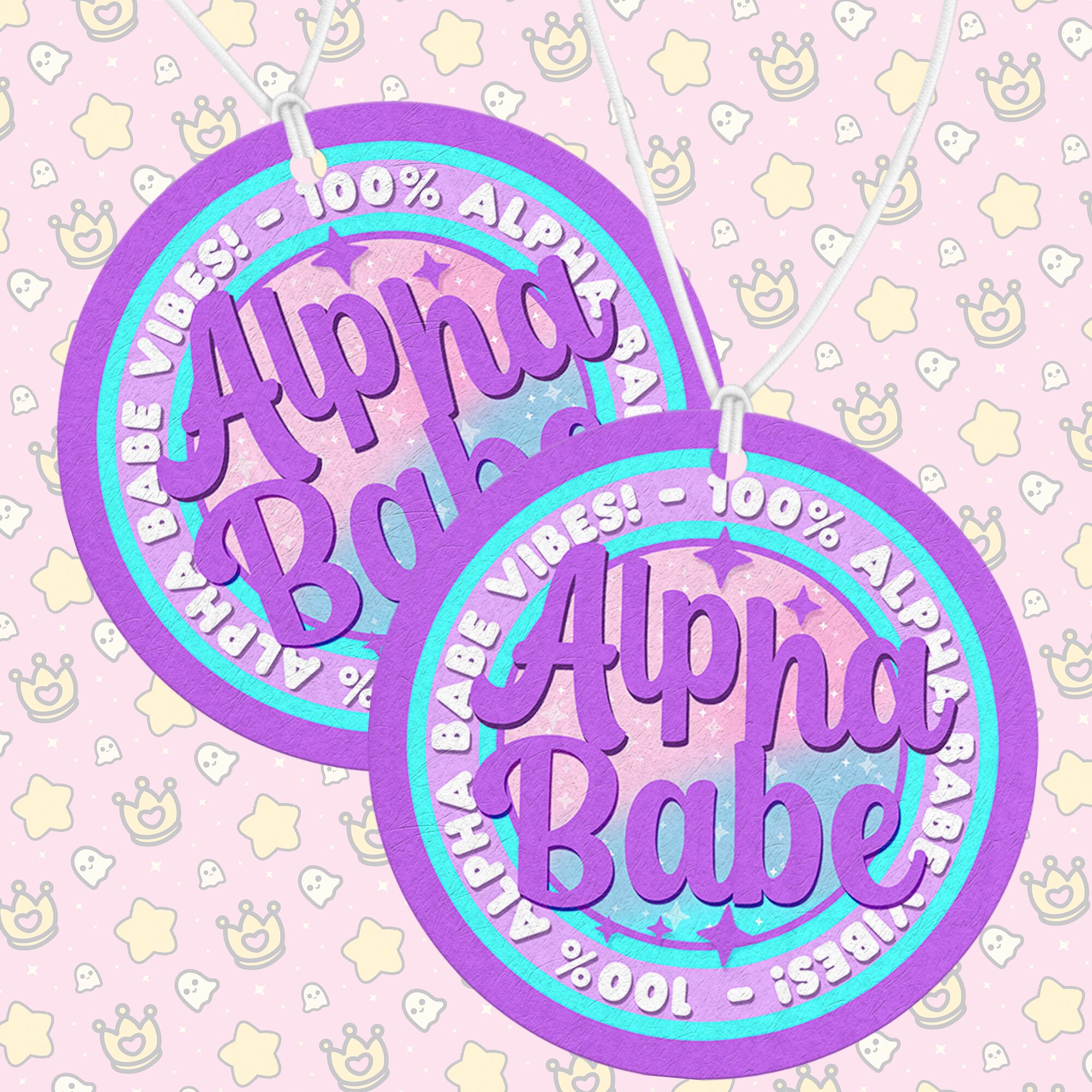 This double-sided air freshener features the empowering phrase “Alpha Babe, 100% Alpha Vibes” set against a vibrant purple background!