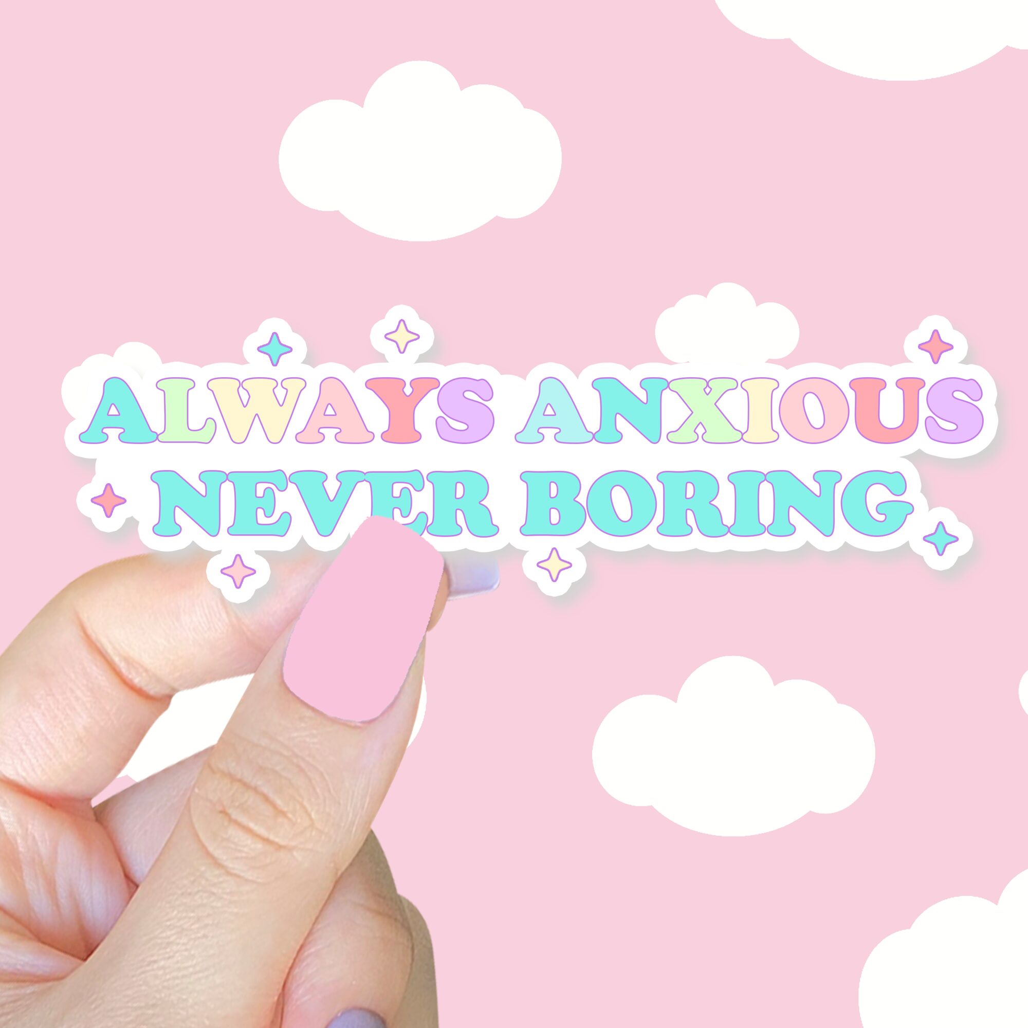 Designed exclusively by Lil Charmery, the “Always Anxious Sticker” is the perfect way to show off your unique personality while adding a dash of fun to your everyday items. Whether you’re decorating your laptop, water bottle, planner, or phone case, this sticker will serve as a reminder that even in moments of anxiety, you’re still full of life and never boring. Its bright rainbow and light-hearted message make it the ideal accessory for anyone who embraces their quirks and anxieties with a sense of humor.