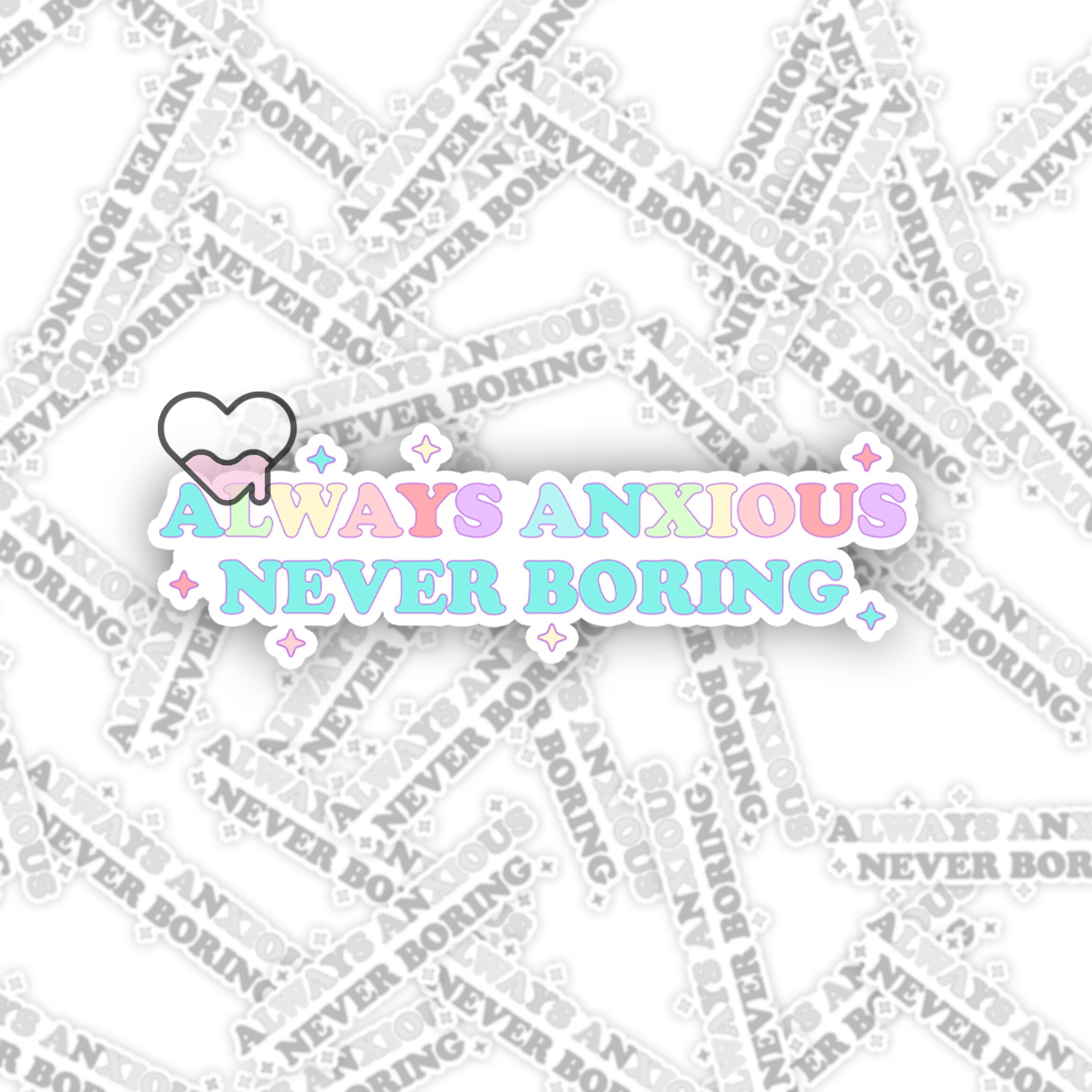 Whether you’re looking to add a little personality to your daily accessories or want to gift someone who can relate to the “always anxious, never boring” mantra, this sticker is the perfect choice. It’s a fun way to express your personality while bringing a smile to your face and those around you. Add it to your collection today, and let it be a constant reminder that even in anxiety, there’s always room for joy and humor!🌈