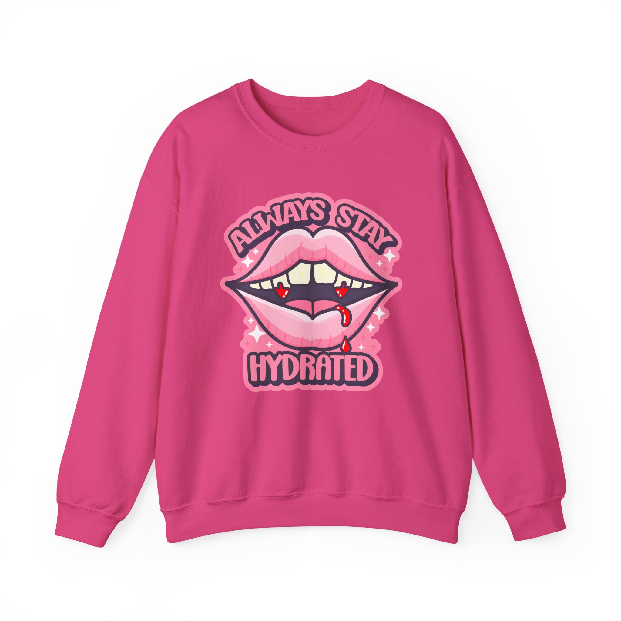 Sink your teeth into style and comfort with the Always Stay Hydrated Vamp Sweatshirt. This playful design features bold pink vampire lips with sharp fangs and just a teasing drip of blood, paired with the cheeky reminder “Always Stay Hydrated”. Equal parts spooky and sassy, it’s a perfect piece for anyone who loves Halloween, vampires, or just a little dark humor mixed with their wardrobe. Whether you’re lounging at home, heading out on a fall night, or showing off your love for vampy vibes, this sweatshirt is sure to turn heads 🧛♀️💋.
