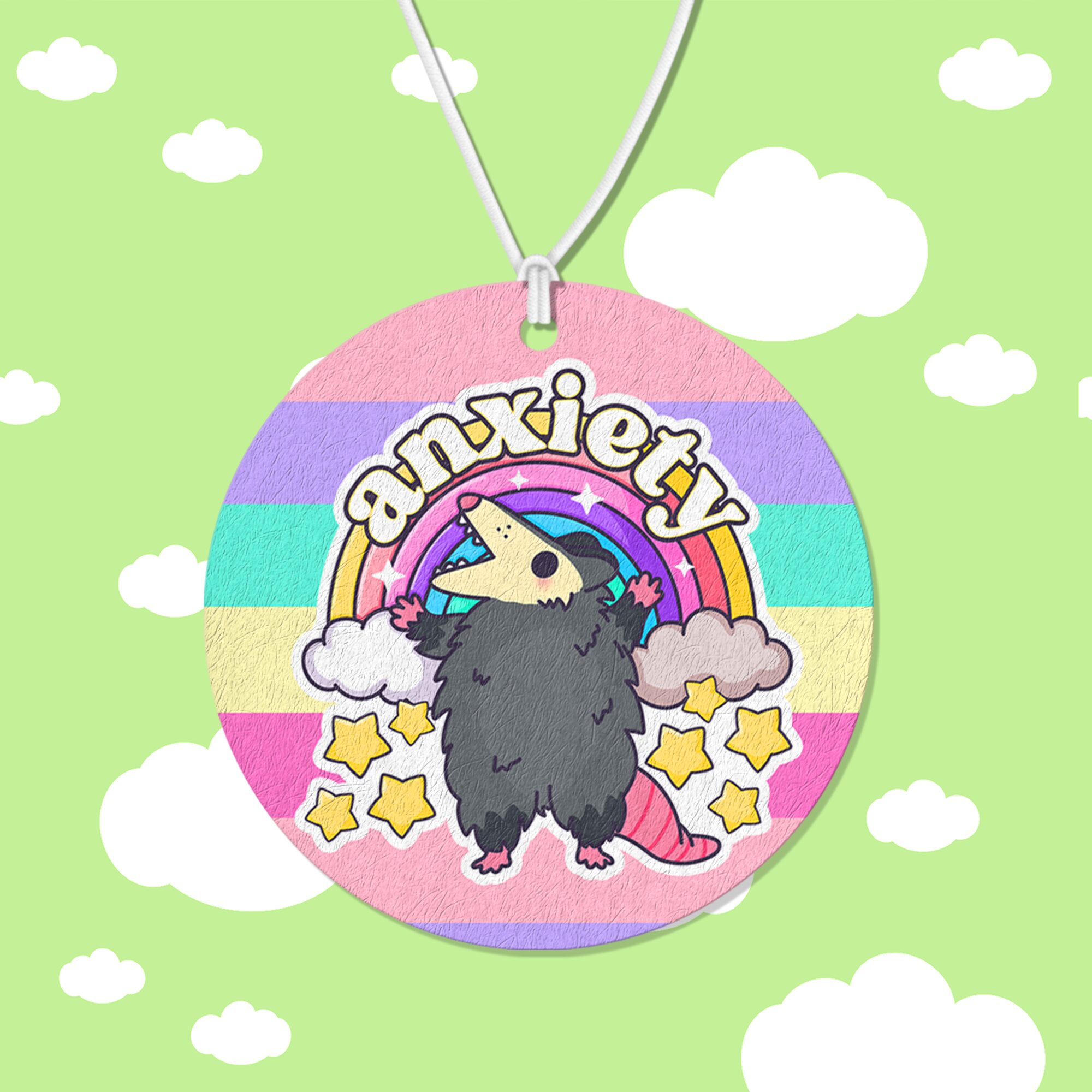 This double-sided air freshener features a wide-eyed possum standing in front of a bright rainbow, screaming the simple yet all-too-familiar word “Anxiety!”