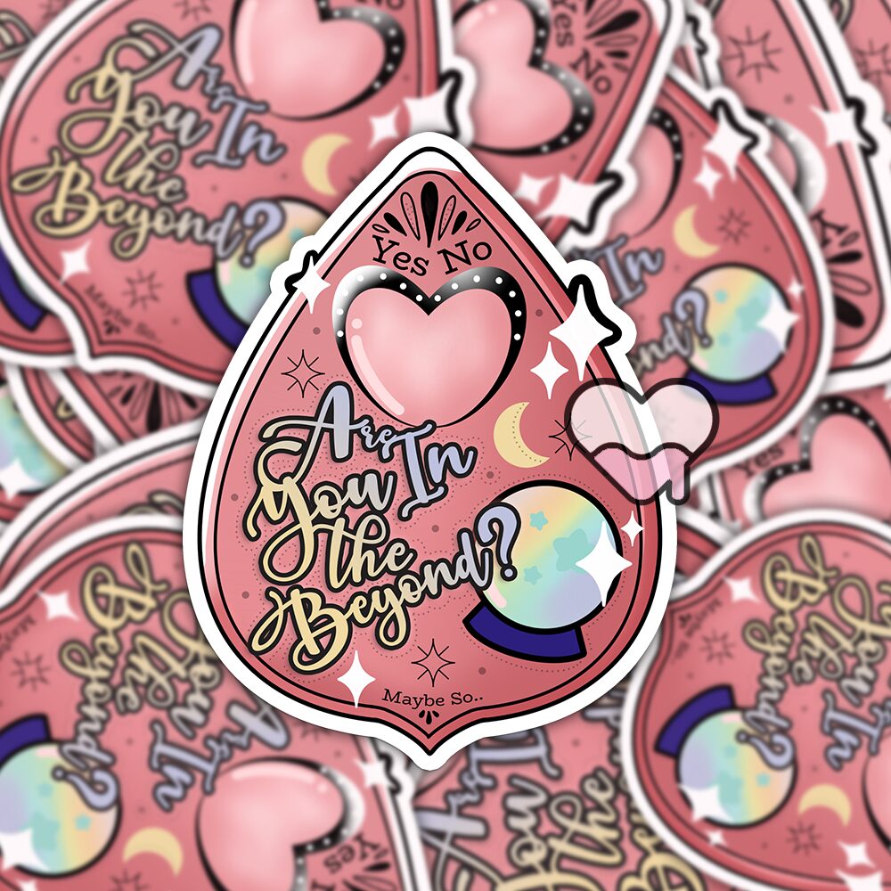 The design’s fun and mysterious aesthetic makes it a standout addition to any collection. The ouija planchette, with its traditional shape, is reimagined in an adorable style that adds a sense of light-hearted spookiness. The phrase “Are You In The Beyond” gives it a humorous twist, making it perfect for anyone who enjoys playing with the boundaries of reality—or at least joking about it! Whether you’re into mystical vibes or just love a good, sassy sticker, this one will add personality and flair to your favorite surfaces.