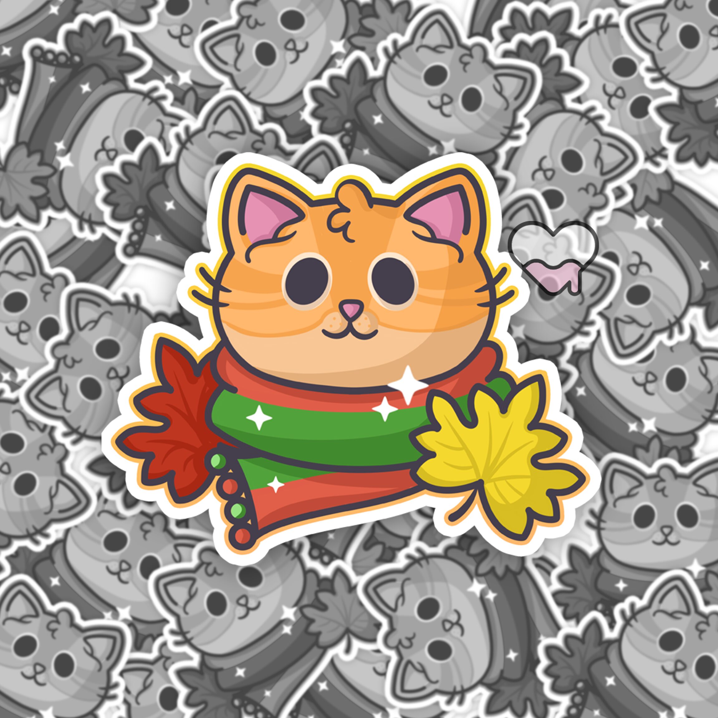 The “Autumn Ginger Kitty Sticker” brings together the whimsical and comforting aspects of the fall season. The cute ginger cat, with its big, round eyes and soft fur, looks perfectly at home in the crisp autumn air. Its scarf, detailed in lovely autumnal colors, adds an extra touch of coziness and charm, giving the cat a warm and friendly appearance that is sure to make anyone smile. The warm tones of the ginger kitty blend harmoniously with the rich palette of autumn—think golden leaves, pumpkin spice, and the gentle glow of a fall sunset.