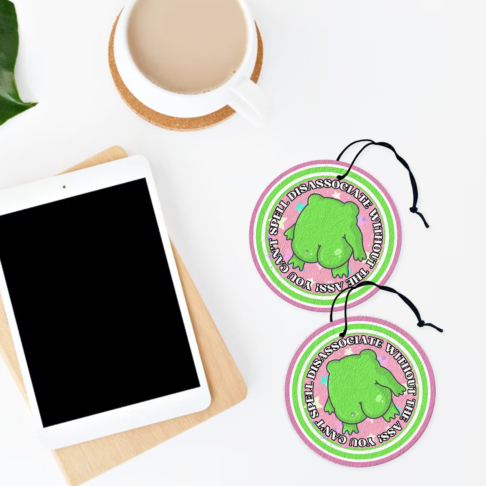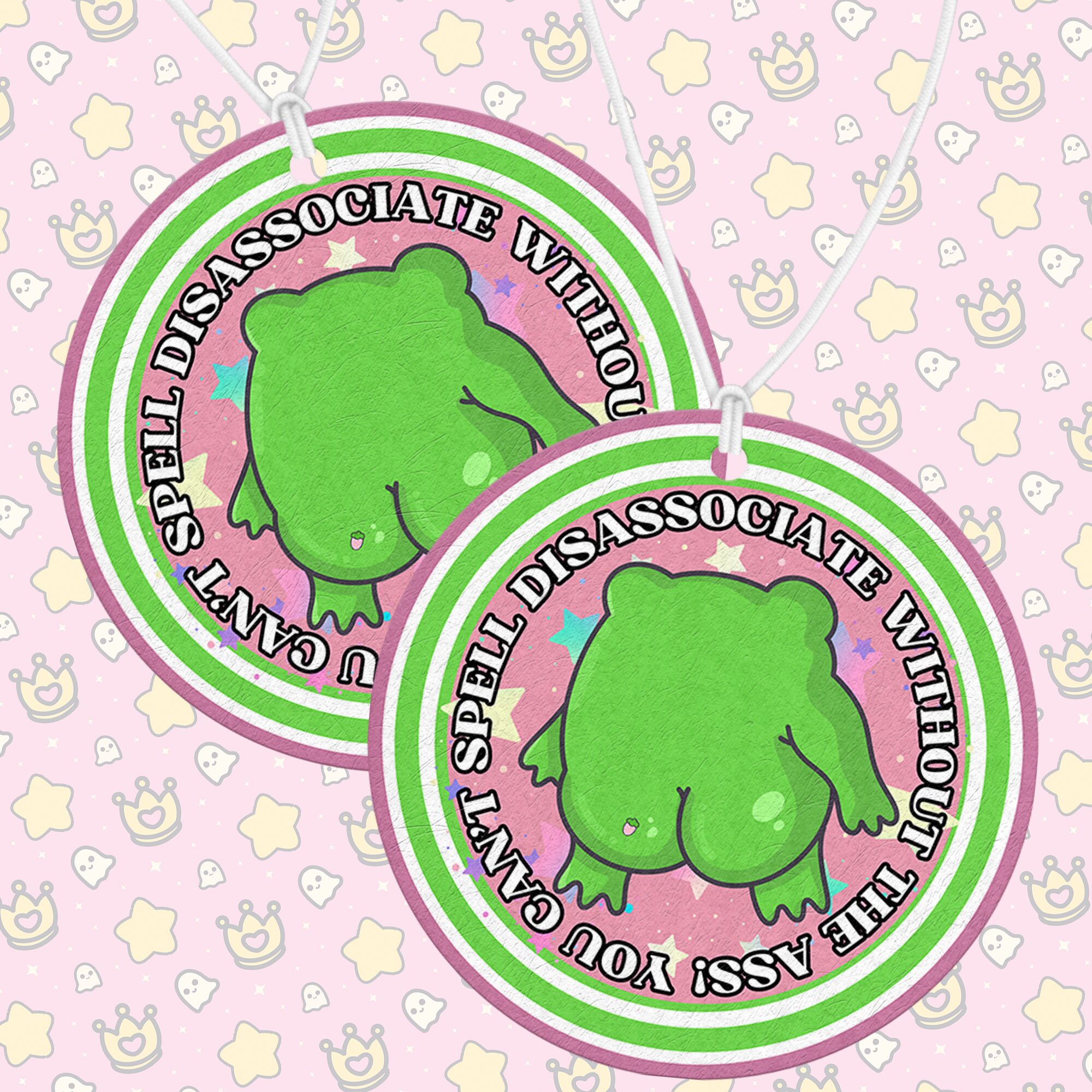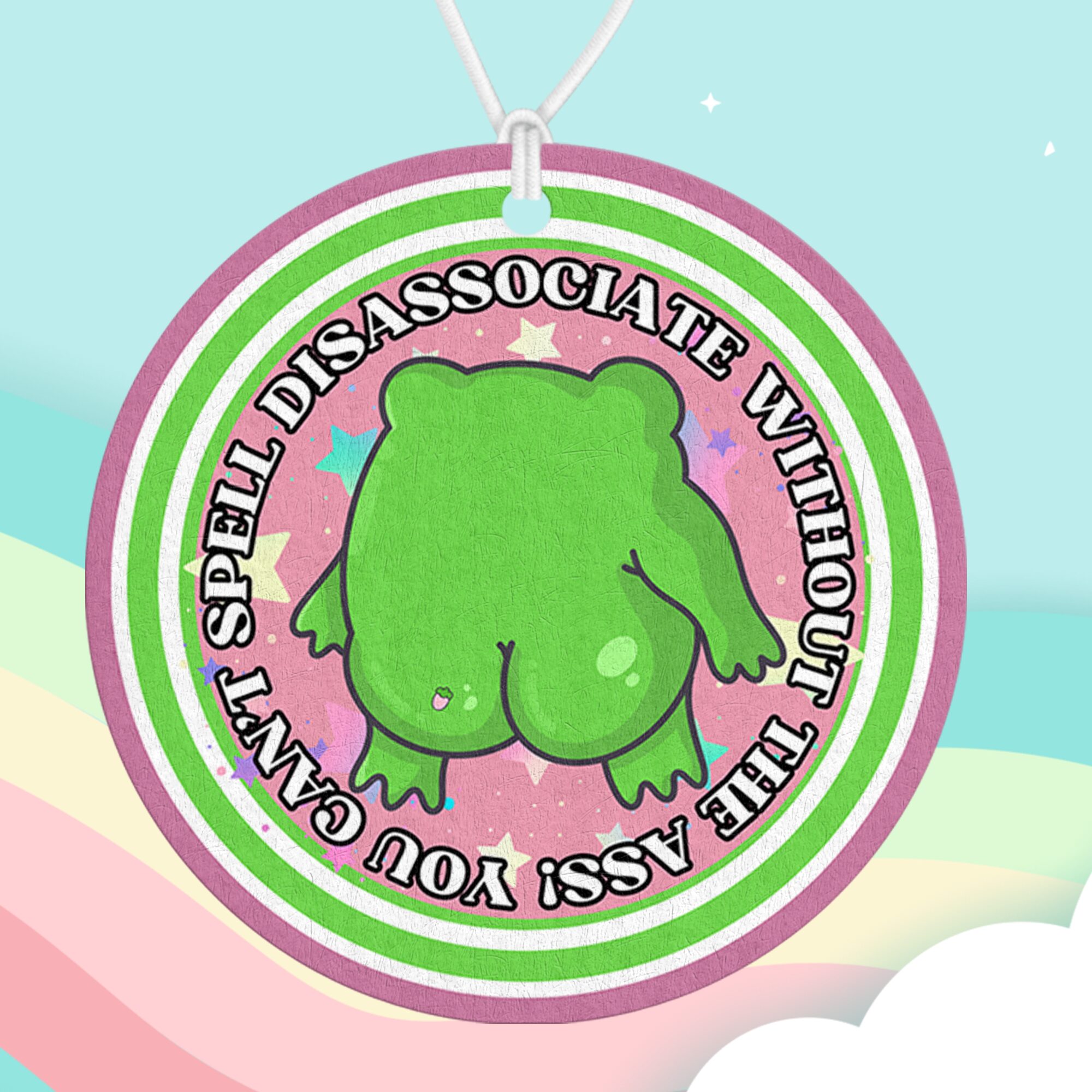 Say hello to chaotic charm with the “Boopie Disassociate Air Freshener,” a hilarious and quirky creation featuring Lil Charmery’s very own Boopie the Frog. Known for his forever-screaming, anxious personality, Boopie takes a new twist in this design by cheekily showing his bum while delivering the witty phrase, “You can’t spell disassociate without the ass.” This air freshener is the perfect mix of humor, relatability, and mischief, bringing a little laugh to your day every time you see it hanging in your car, your bedroom, or anywhere you need a boost of silliness. 🐸🍑