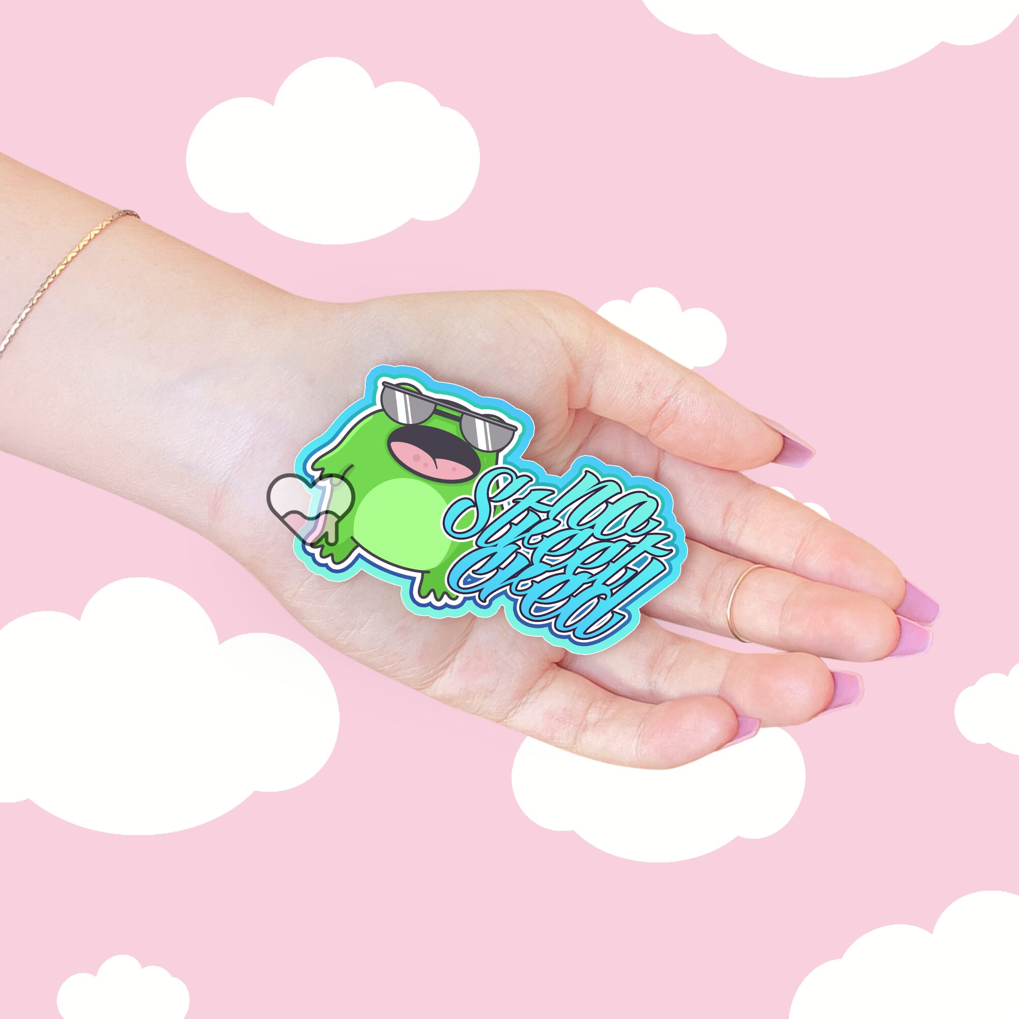 Meet Boopie The Frog like you’ve never seen him before — rocking a pair of cool sunglasses, looking like he’s ready to drop a fire mixtape or cruise down the boulevard. There’s just one small problem: Boopie has absolutely no street cred. None. Zero. Zilch. And that’s exactly what makes this sticker so ridiculously funny and relatable.