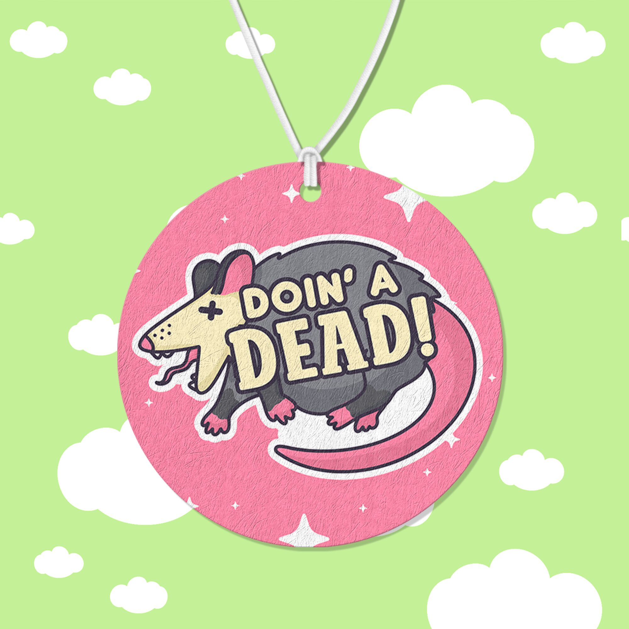Add a quirky touch of humor and charm to your space with the “Doin A Dead Air Freshener.” Featuring an adorable possum playing dead!