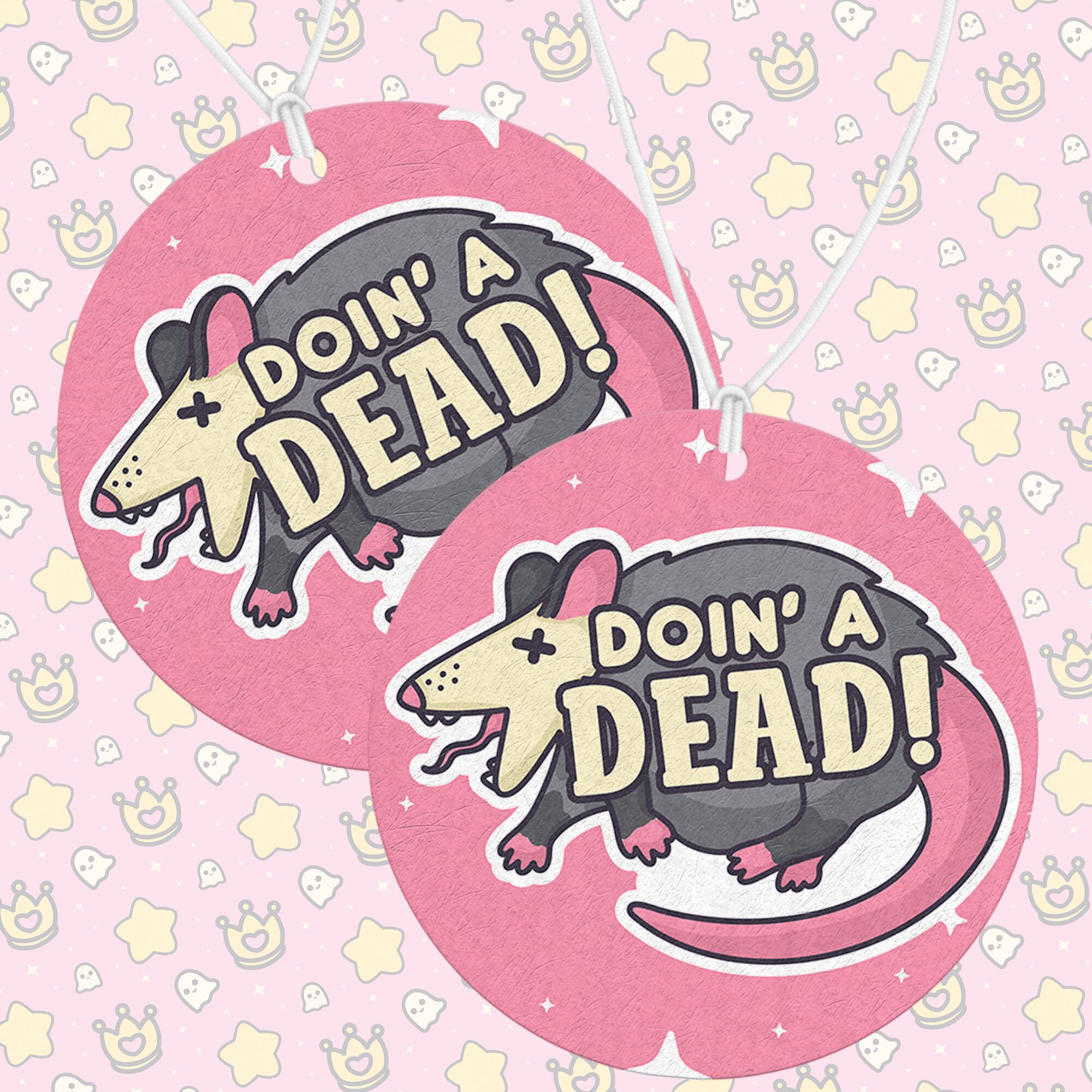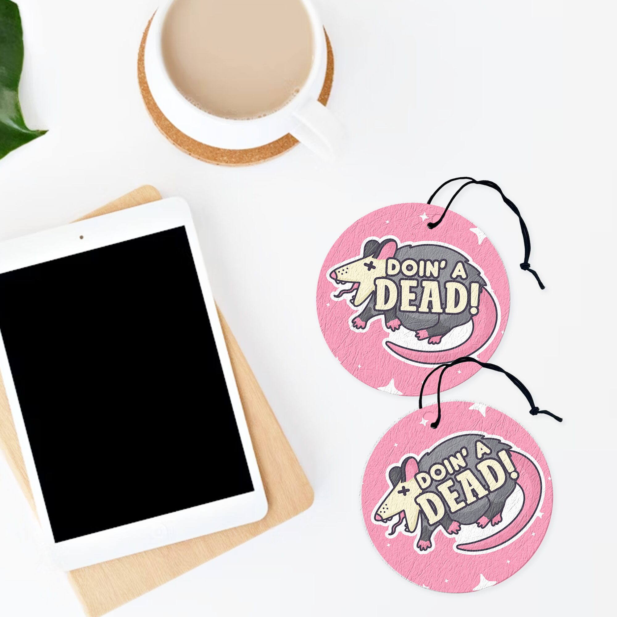 Each “Doin A Dead Air Freshener” is carefully crafted in-house, ensuring every detail—from the possum’s comical pose to its expressive little features—is vividly captured. Printed on both sides, the design is always visible no matter how it hangs, turning a simple air freshener into a small decorative piece that adds personality and humor to any environment. Its mix of whimsy, sarcasm, and cuteness makes it impossible not to smile every time you see it.