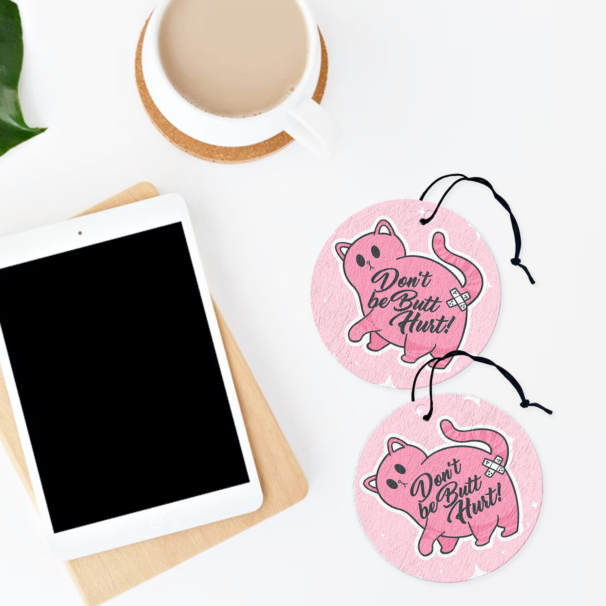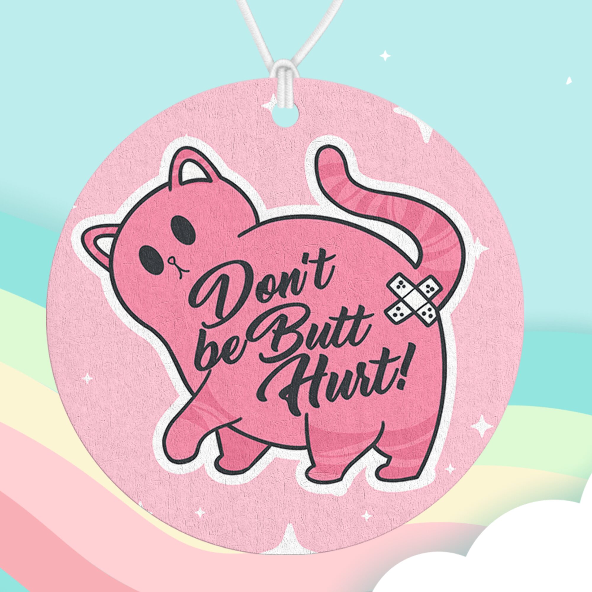 Bring a playful and cheeky vibe to your space with the “Dont Be Butthurt Air Freshener.” Featuring an adorable cat showing off its little booty!
