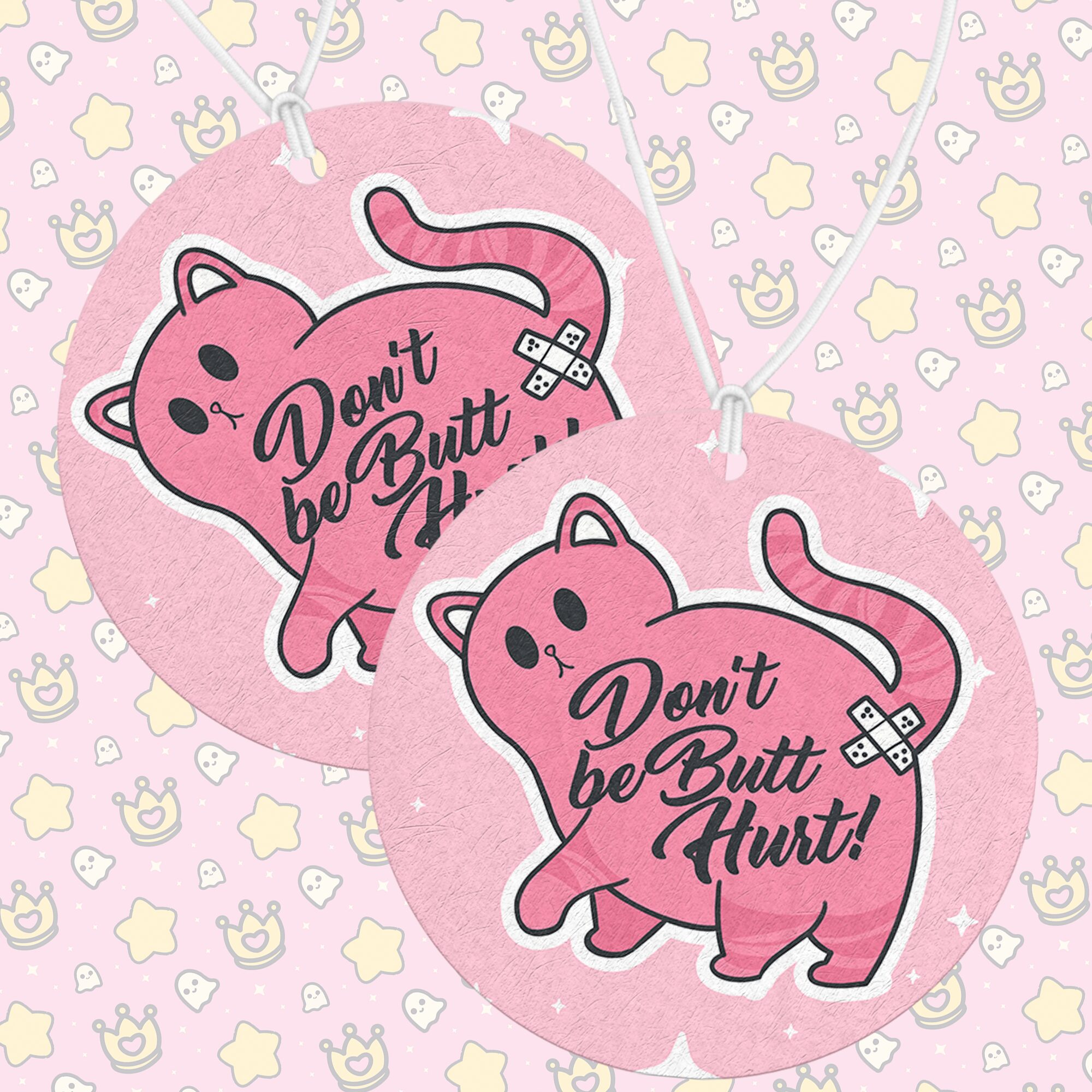 Each “Dont Be Butthurt Air Freshener” is lovingly crafted in-house, ensuring that every detail—from the cat’s mischievous pose to its expressive little features—is vividly captured. Printed on both sides, the design is always visible, no matter how it hangs, transforming a simple air freshener into a small decorative piece that adds personality, charm, and a little playful sass wherever it’s displayed. Its combination of humor and cuteness makes it a perfect conversation starter and a constant mood-lifter.