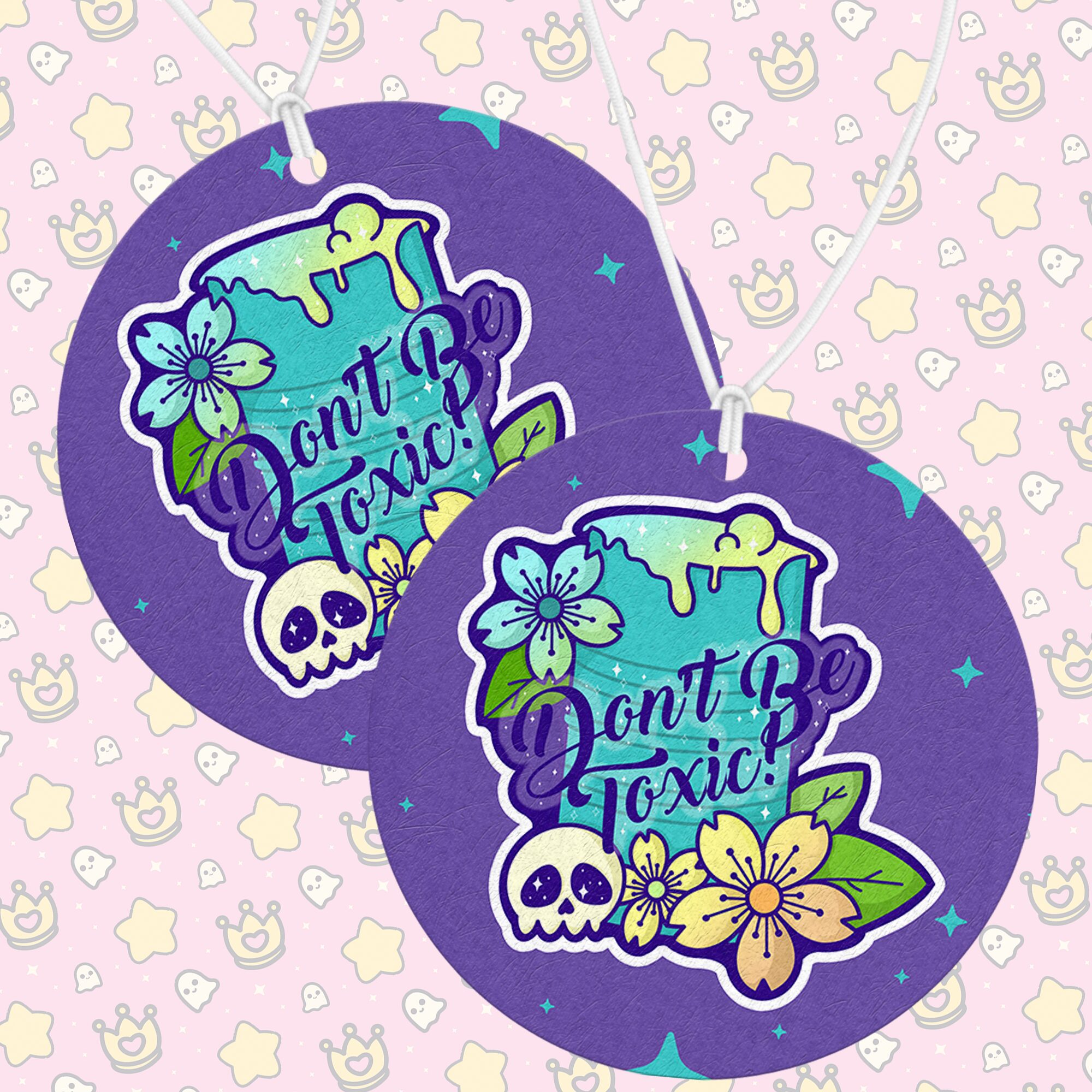Add a fun and slightly edgy touch to your space with the “Dont Be Toxic Air Freshener.” This double-sided air freshener features a bubbling toxin bin accompanied by the playful phrase “Dont Be Toxic,” combining humor and a subtle reminder to keep vibes positive. Lil Charmery’s exclusive artwork brings this quirky design to life, making it a bold, eye-catching accessory for your car, bedroom, or workspace. ☣️💚