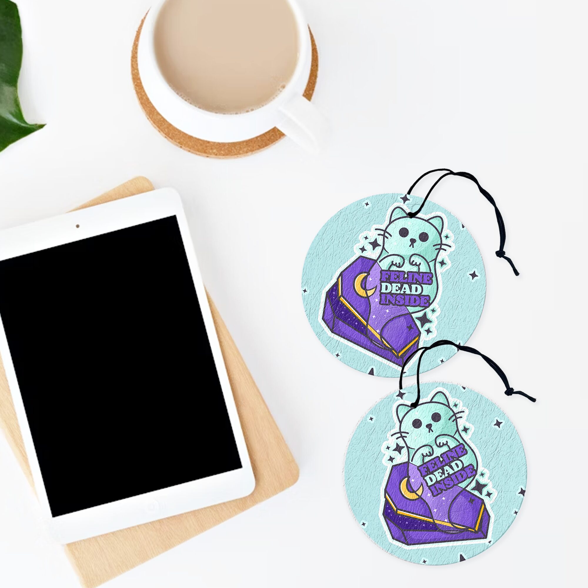 Each “Feline Dead Inside Air Freshener” is crafted in-house with meticulous attention to detail, capturing every element of the scene—from the ghostly glow of the kitty to the subtle shadows of the coffin. Printed on both sides, the design is always visible no matter how it hangs, transforming a simple air freshener into a small decorative piece that adds personality, charm, and a touch of spooky fun wherever it’s displayed. Its playful take on the “dead inside” sentiment makes it a quirky and relatable accessory that resonates with anyone who enjoys offbeat humor.