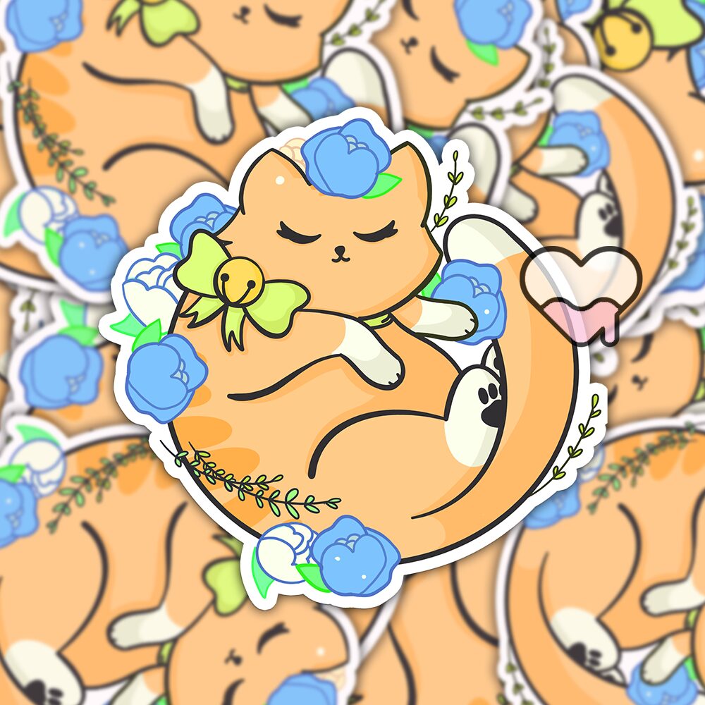 The Floral Orange Kitty Sticker is a warm and cheerful design that radiates comfort and charm. At its heart is a sweet orange cat, curled up in the most peaceful little ball, its golden bell glinting like a tiny drop of sunshine. The cat’s fur is rich with cozy, warm tones, giving it a welcoming and friendly presence that’s instantly heartwarming. 🐱💛