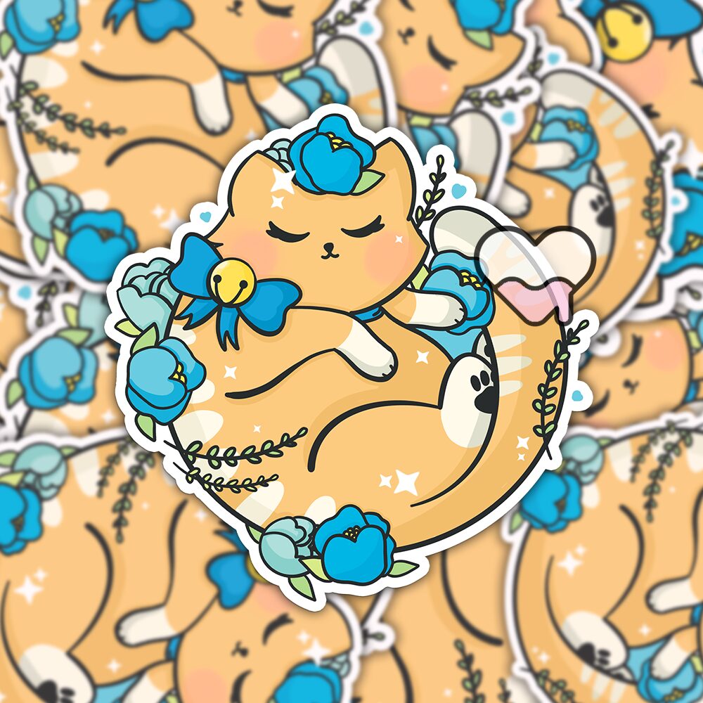 The Floral Tabby Kitty Sticker is a heartwarming blend of coziness and beauty, designed for cat lovers and floral enthusiasts alike. At its center is a sweet orange tabby, curled up in the most peaceful, contented pose, as if it’s found the perfect sunny spot for an afternoon nap. Its soft orange fur is marked with gentle tabby stripes, bringing a sense of warmth and familiarity that only a beloved kitty can inspire. Around its neck sits a dainty golden bell, catching the light in a way that adds just the right touch of charm and whimsy. 🐾✨