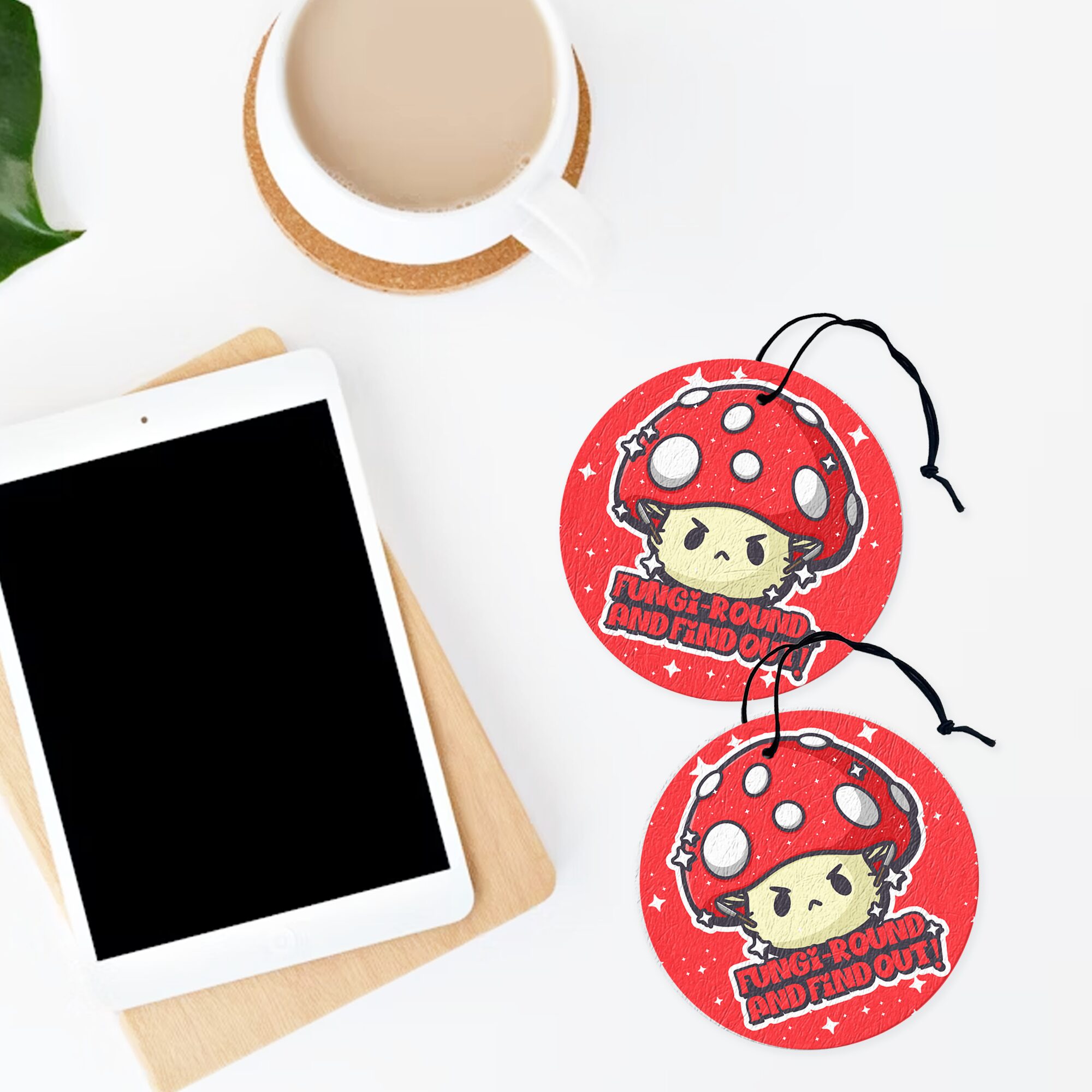 Each “Fungi Round And Find Out Air Freshener” is carefully crafted in-house, ensuring that every element—from the mushroom’s determined eyes to the tiny knives held in its hands—is vividly preserved. Printed on both sides, the playful design is always visible no matter how it hangs, transforming a simple air freshener into a small decorative piece that adds personality, humor, and a touch of unexpected mischief wherever it’s displayed. Its combination of cute and slightly edgy makes it a unique accessory that stands out in any space.