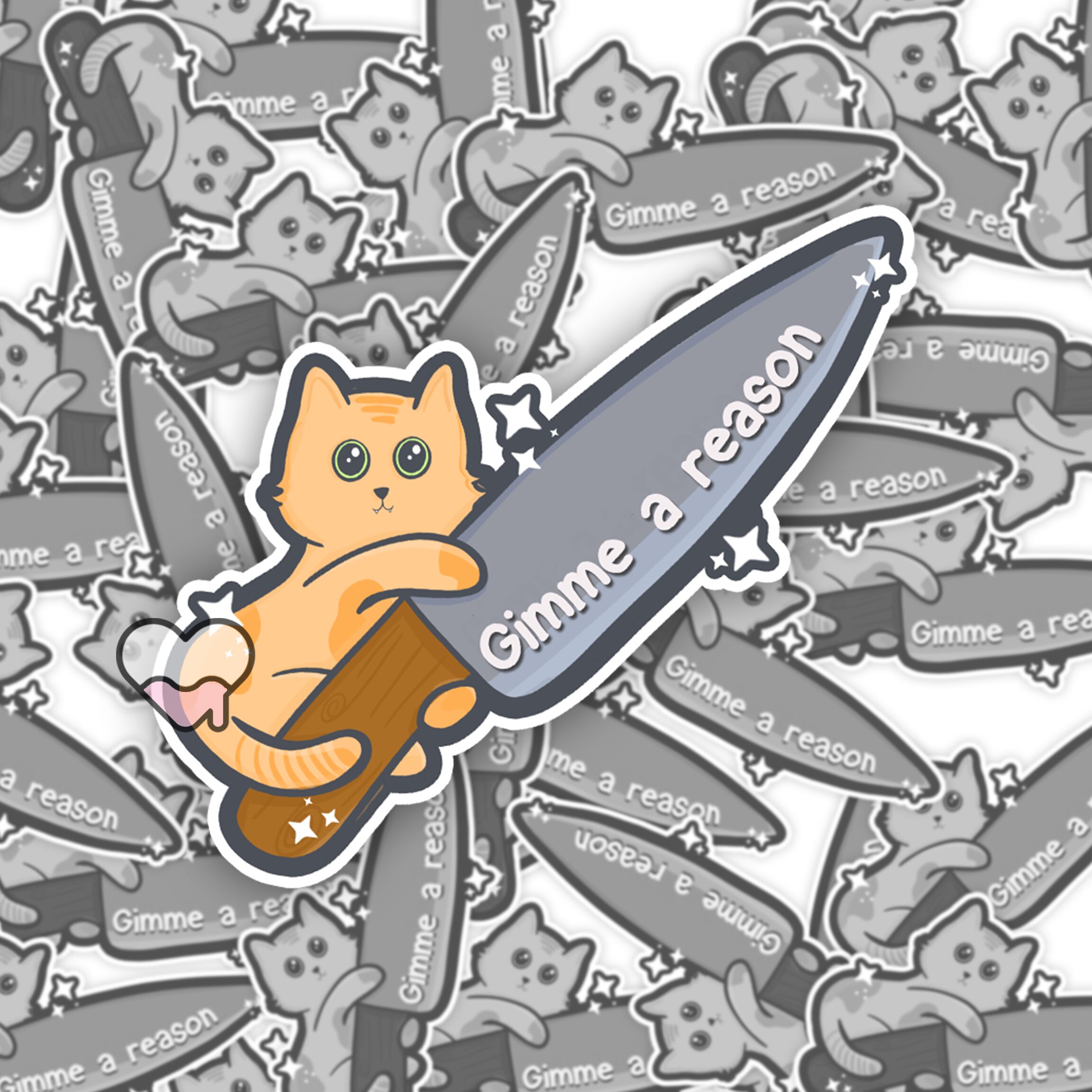The illustration style keeps the cat’s charm front and center, while the oversized knife and bold lettering balance the cuteness with a playful edge. The phrase “Gimme a Reason!” is cheeky without being harsh, making it a lighthearted way to show off a little bit of attitude. Whether you see it as a funny cat meme brought to life or simply a charmingly dramatic character, this sticker is bound to make you smile every time you see it.