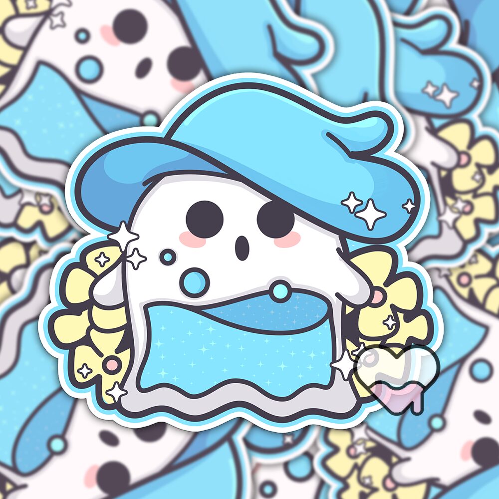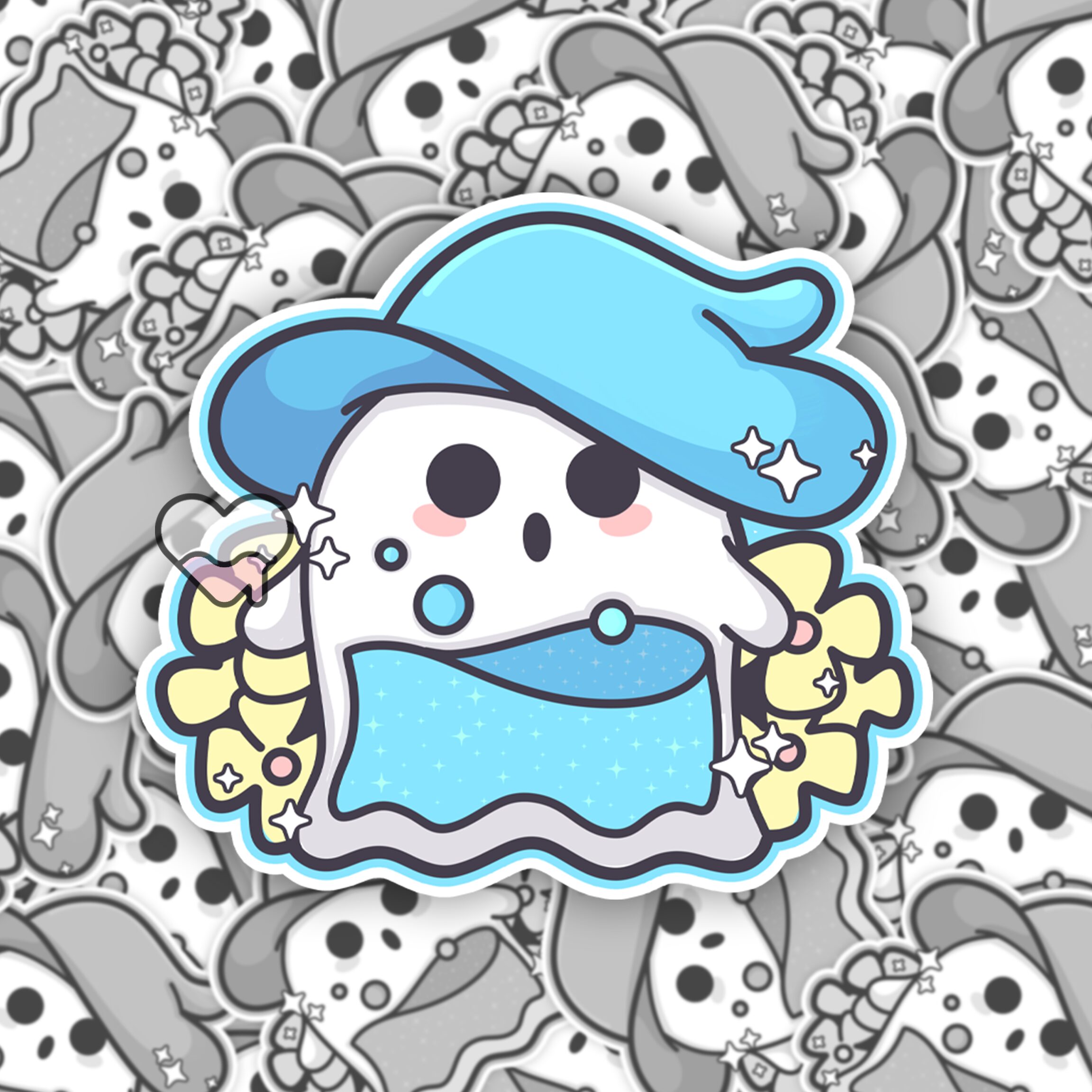 Perhaps the most captivating detail is the shimmering blue sparkly liquid swirling inside the ghost’s belly. This tiny yet mesmerizing feature makes the design feel alive, as though the ghost carries a little piece of the night sky or a vial of enchanted potion within it. It’s an unexpected and magical twist that turns an already adorable design into something truly special. The soft, cool tones of blue paired with the purity of the white flowers create a calming and dreamy aesthetic, making this sticker as soothing to look at as it is cute.