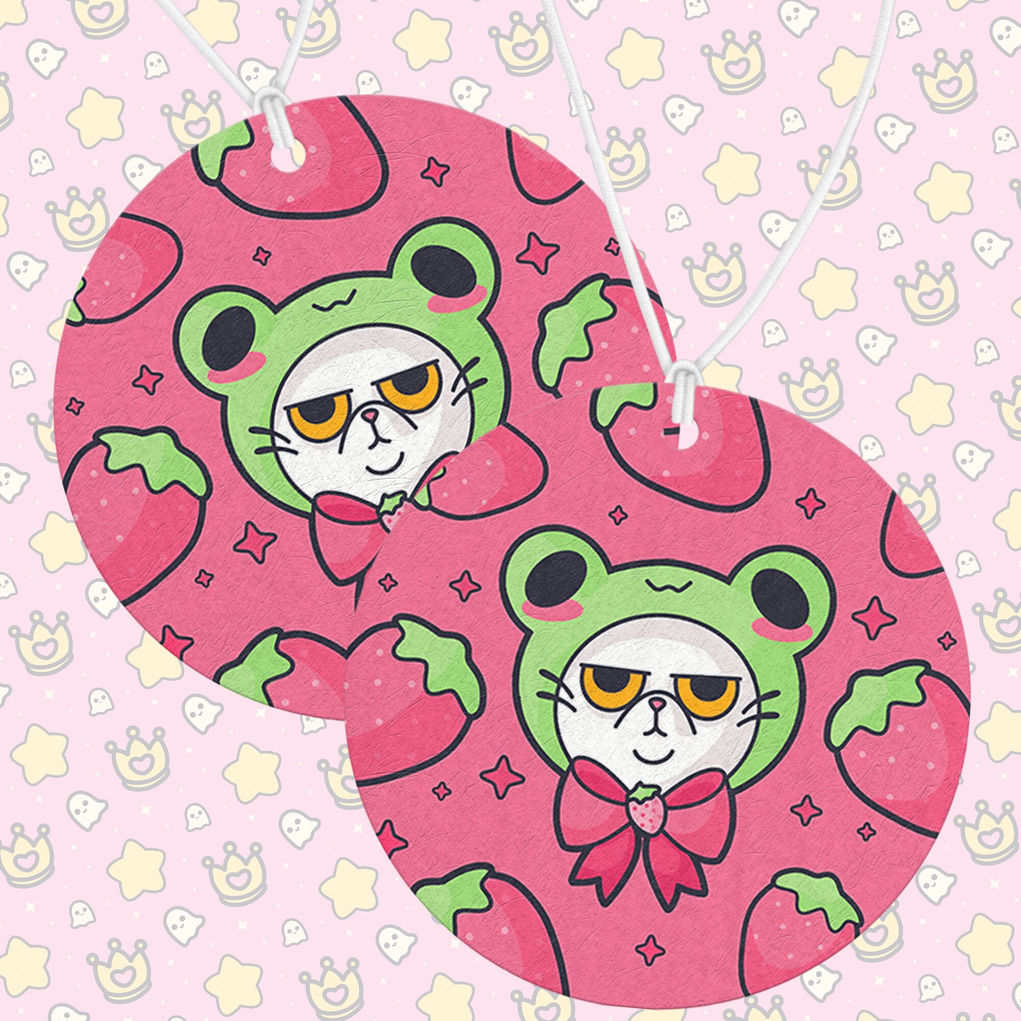 Each “Grumpy Strawberry Cat Air Freshener” is carefully crafted in-house, ensuring that every detail—from the cat’s furrowed brows to the tiny frog hat perched jauntily on its head—is vividly preserved. Printed on both sides, the artwork is always visible no matter how it hangs, transforming a simple air freshener into a decorative piece that adds personality, humor, and charm wherever it’s displayed. Its mix of grumpy sass and whimsical sweetness makes it a standout accessory that brightens any space while eliciting smiles and laughter.