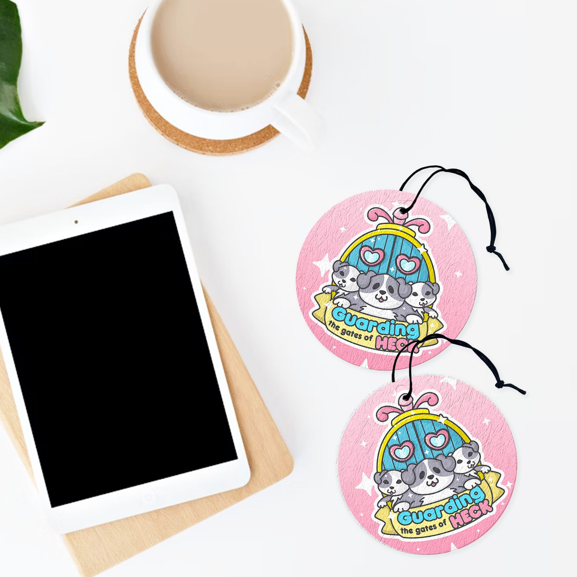 Each “Guarding The Gates of Heck Air Freshener” is meticulously crafted in-house, ensuring that every detail—from the puppy’s playful eyes to its tiny, wagging tails—is beautifully rendered. Printed on both sides, the artwork is always visible no matter how it hangs, transforming a simple air freshener into a charming decorative piece that adds humor, personality, and mythical whimsy wherever it’s placed. The combination of ferocious mythology and puppy cuteness creates a strikingly fun contrast that makes this design uniquely captivating.