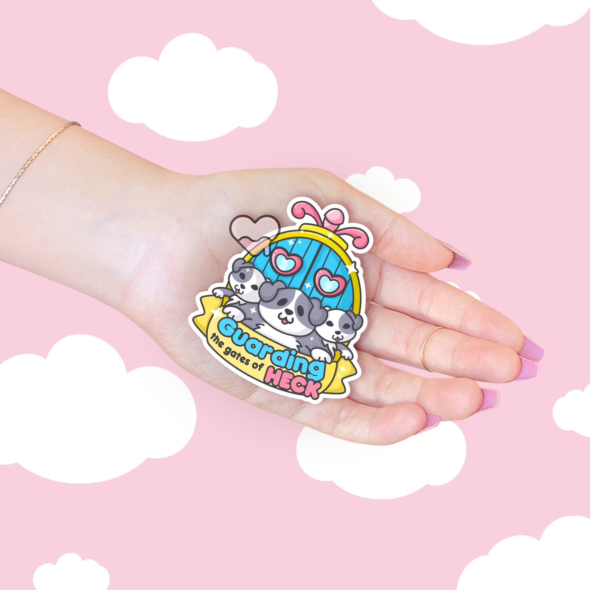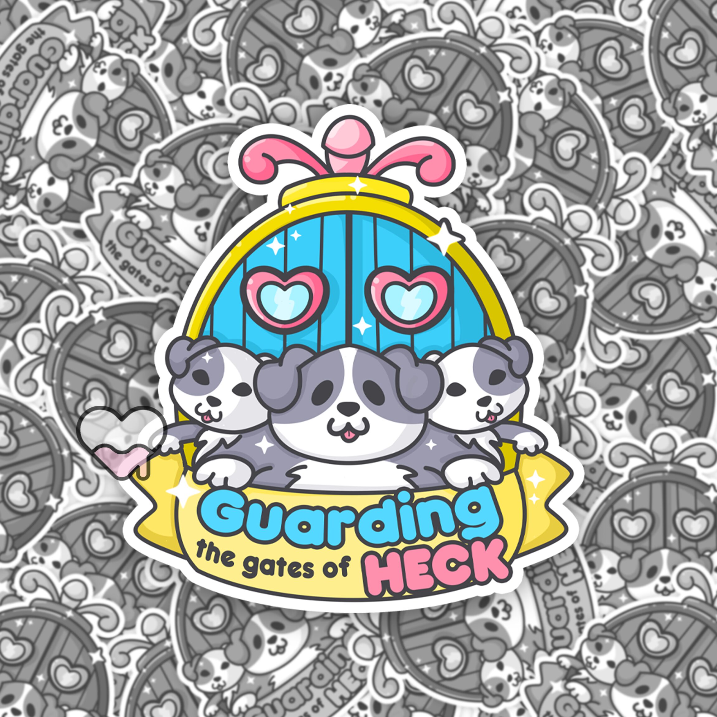 Behind this charming trio stand the striking blue gates to “heck,” a whimsical twist on the classic underworld entrance. Instead of something dark or frightening, these gates feel inviting and magical, glowing with a soft, enchanting blue that sets the scene perfectly. It’s as if the gates lead not to doom, but to a land of silly mischief and harmless chaos. The gentle balance of fantasy elements with the heart-melting cuteness of the Cerberus puppy makes this sticker truly unique.