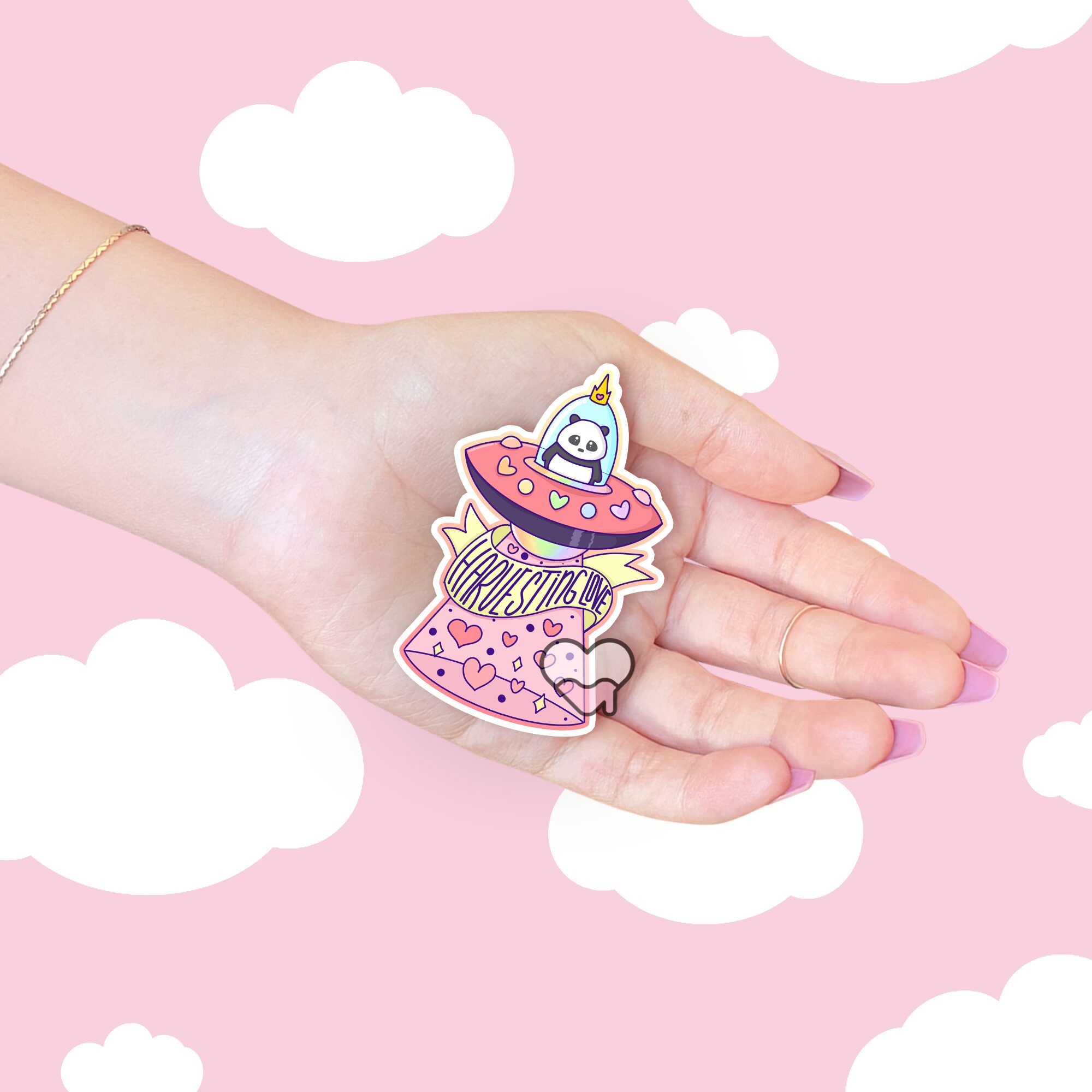 This sticker feels like a little story you can carry with you—a tale of an interstellar panda who travels from planet to planet, collecting love and spreading joy wherever they go. The UFO’s soft, rounded design gives it a friendly, approachable vibe, while the panda’s expression radiates calm and contentment, making it easy to smile just looking at it. The neon lettering gives the piece an extra pop, making it feel alive with energy, as though you could almost hear the hum of the ship’s engines in the distance.