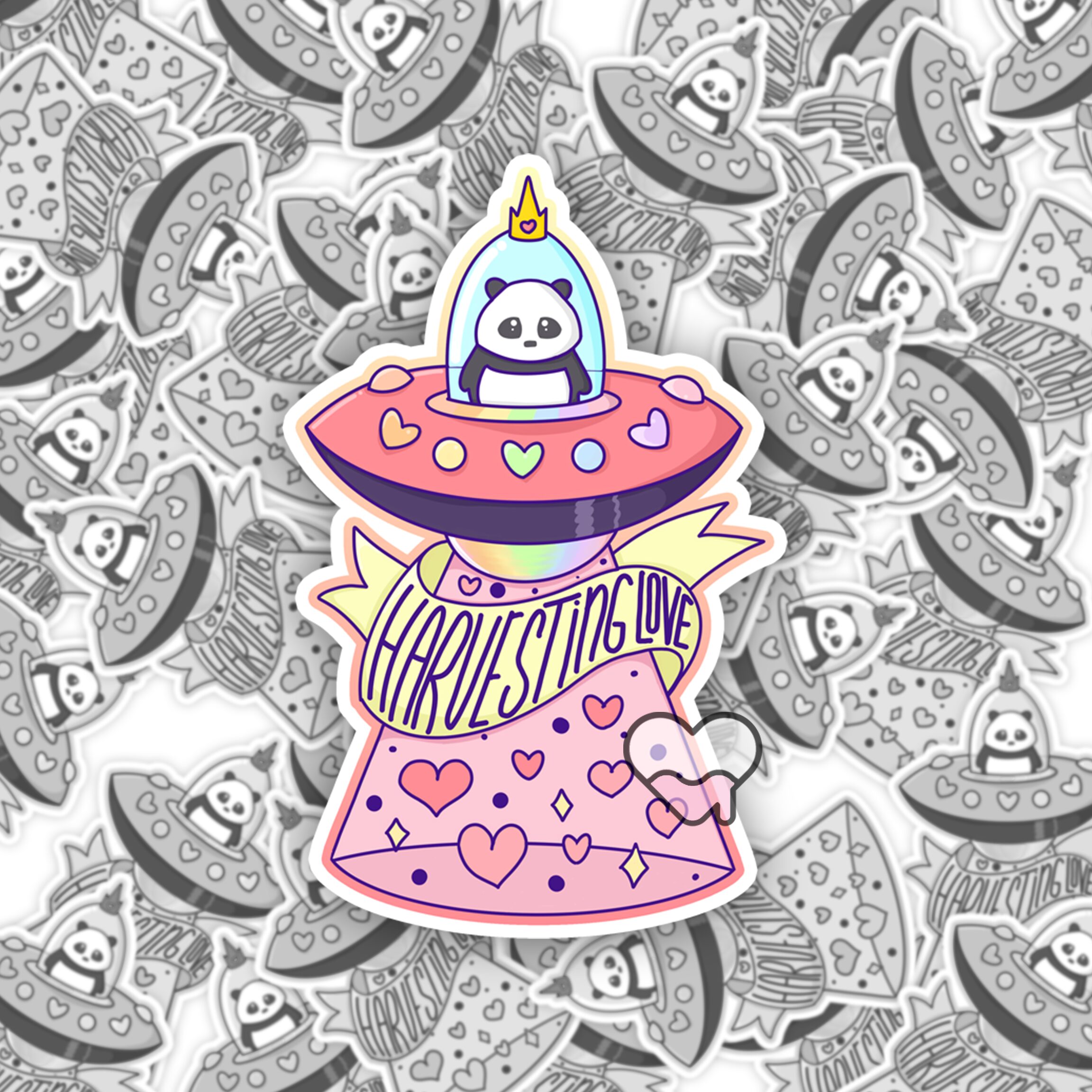The Harvesting Love Panda Sticker is an irresistibly charming design that blends the whimsy of outer space with the sweetness of pure affection. At its heart is an adorable panda, cozily situated at the controls of a small UFO, ready to beam up hearts and happiness from across the galaxy. The words “Harvesting Love.” glow brightly in playful neon letters, adding a modern, vibrant touch that contrasts beautifully with the cute, cartoon-like illustration. 🚀