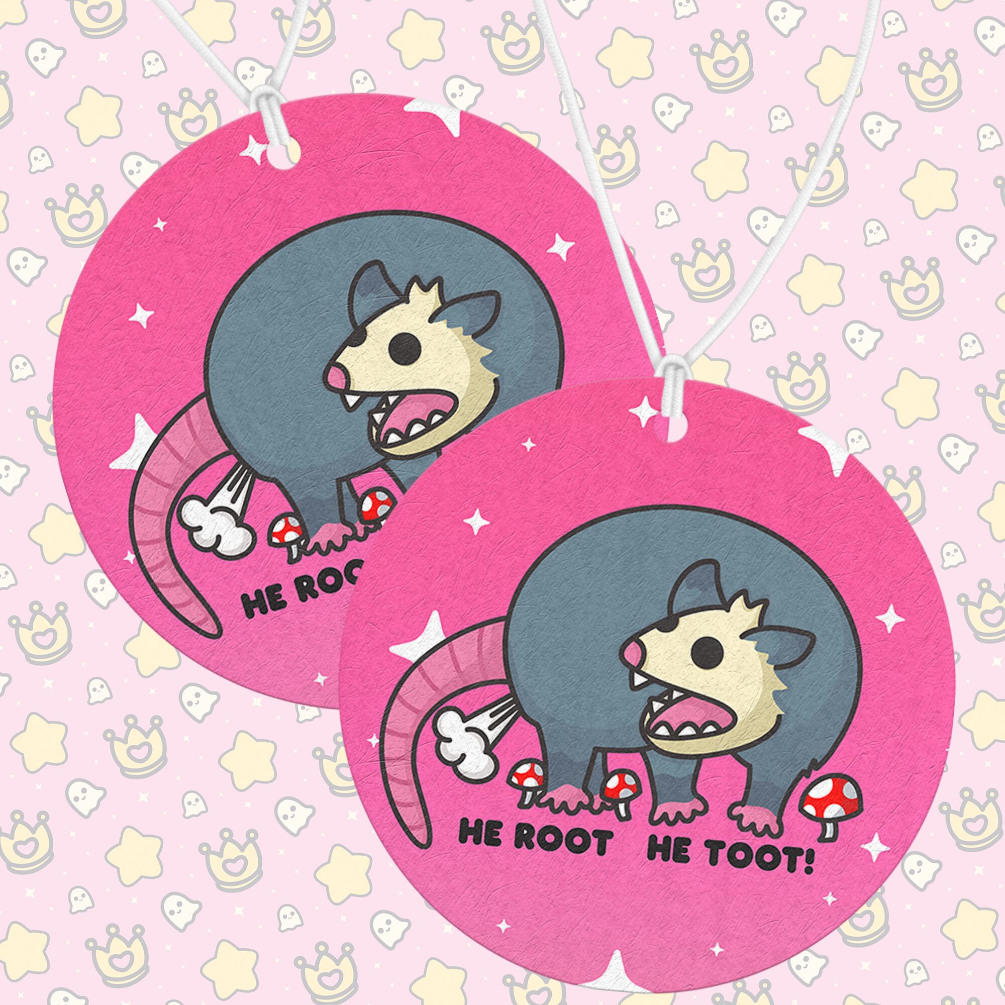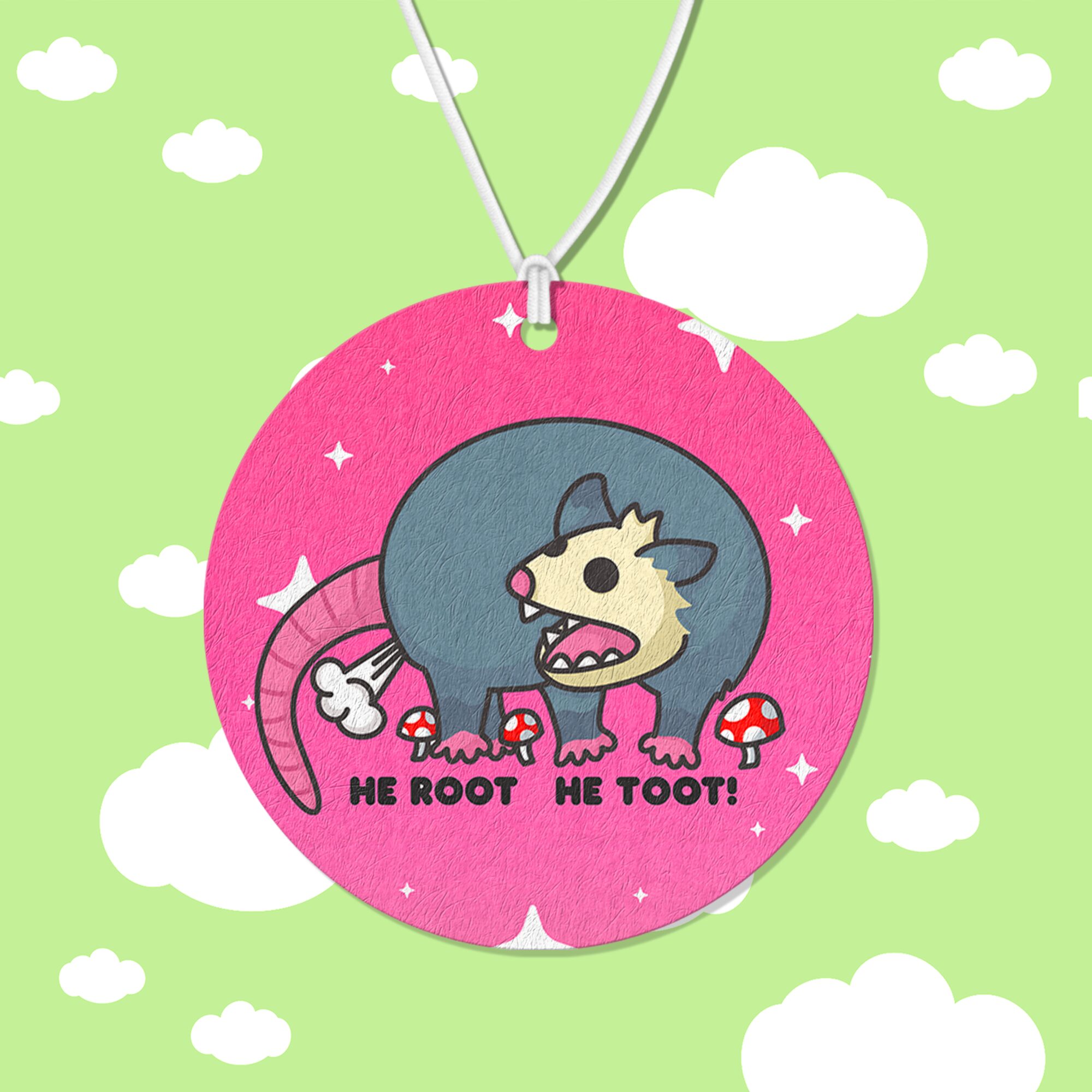 Bring a hilariously cheeky dose of personality to your space with the “He Root He Toot Air Freshener.” This double-sided air freshener features a screaming possum caught in a moment of pure silliness, staring at its own booty while letting out a little toot, surrounded by whimsical mushrooms. Paired with the playful phrase “He Root He Toot,” Lil Charmery’s exclusive artwork perfectly captures the mischievous, absurd humor of this scene, making it an irresistibly funny and quirky addition to any space. 🐾🍄💨
