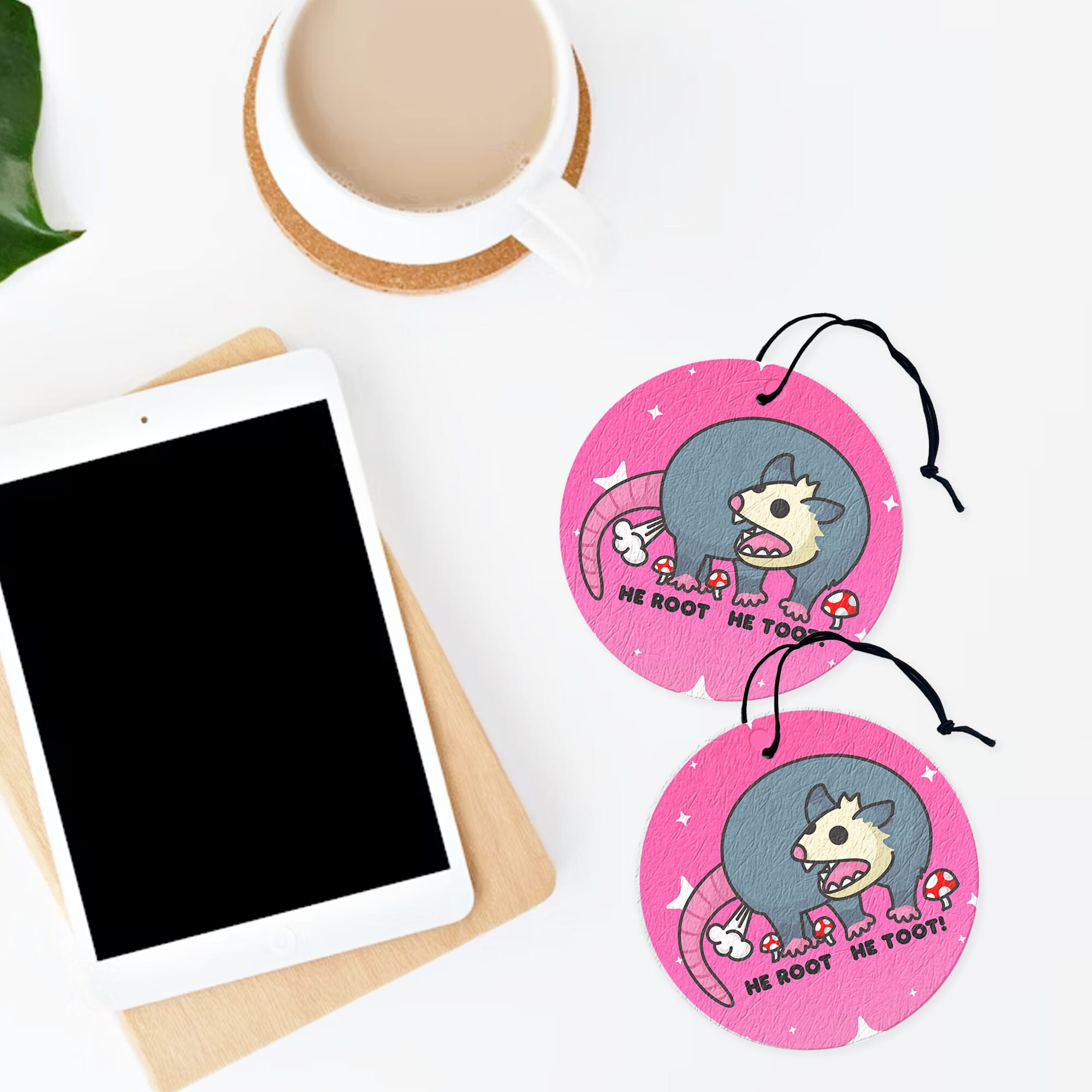 Each “He Root He Toot Air Freshener” is carefully crafted in-house, ensuring that every detail—from the possum’s wide-eyed expression to the vibrant mushrooms around it—is vividly preserved. Printed on both sides, the design is visible no matter how it hangs, transforming a simple air freshener into a decorative piece that adds charm, humor, and a touch of absurd whimsy wherever it’s placed. Its combination of playful mischief and delightfully silly visuals makes it a standout accessory that never fails to bring a smile.