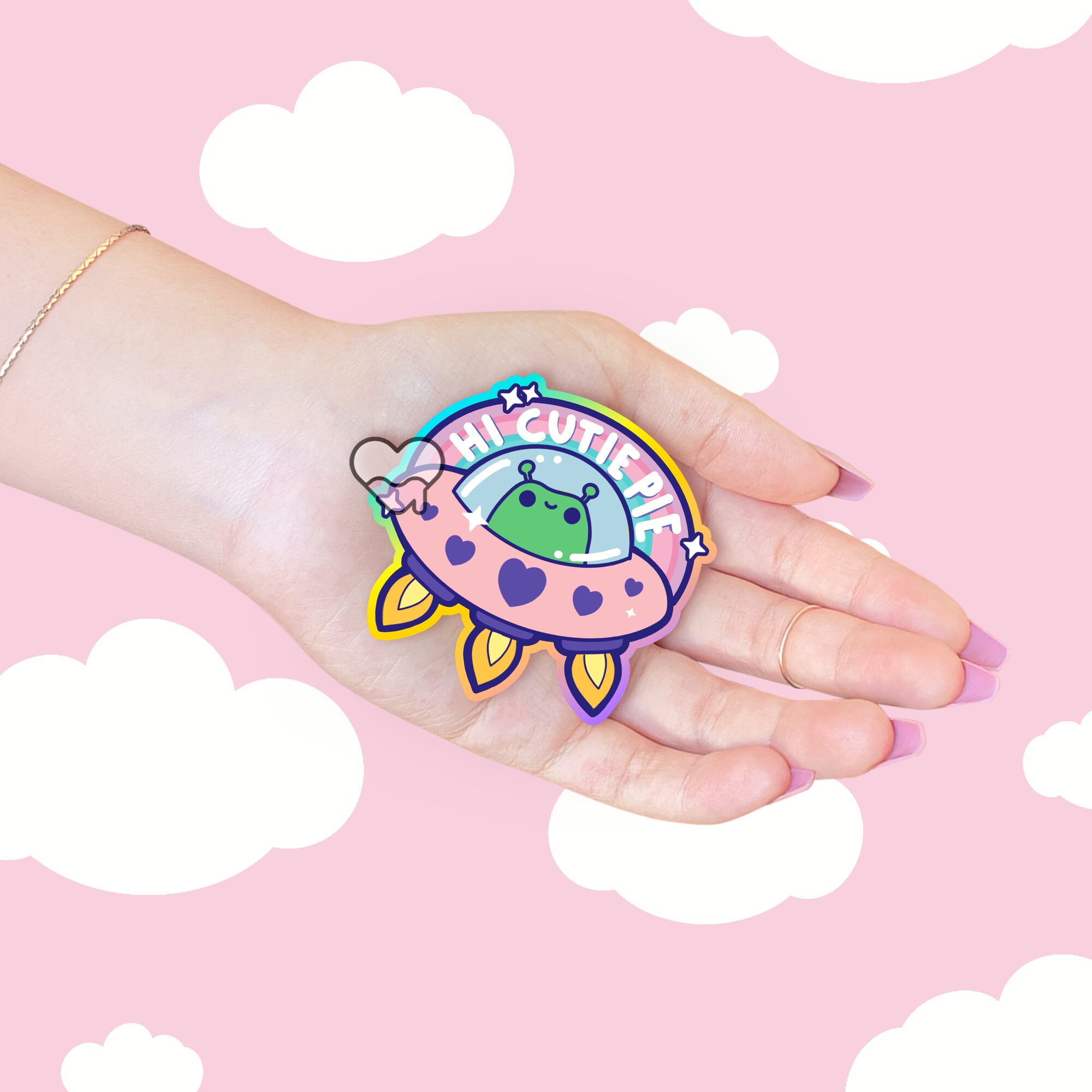 Whether you’re a die-hard sci-fi fan, a lover of all things cute, or someone who simply enjoys a good pun, this sticker fits the bill. 🚀 It’s playful, endearing, and full of interstellar charm, making it the perfect little addition to brighten up your belongings. With this adorable alien by your side, every day feels like a delightful adventure through space—one “Hi Cutie Pie!” at a time.