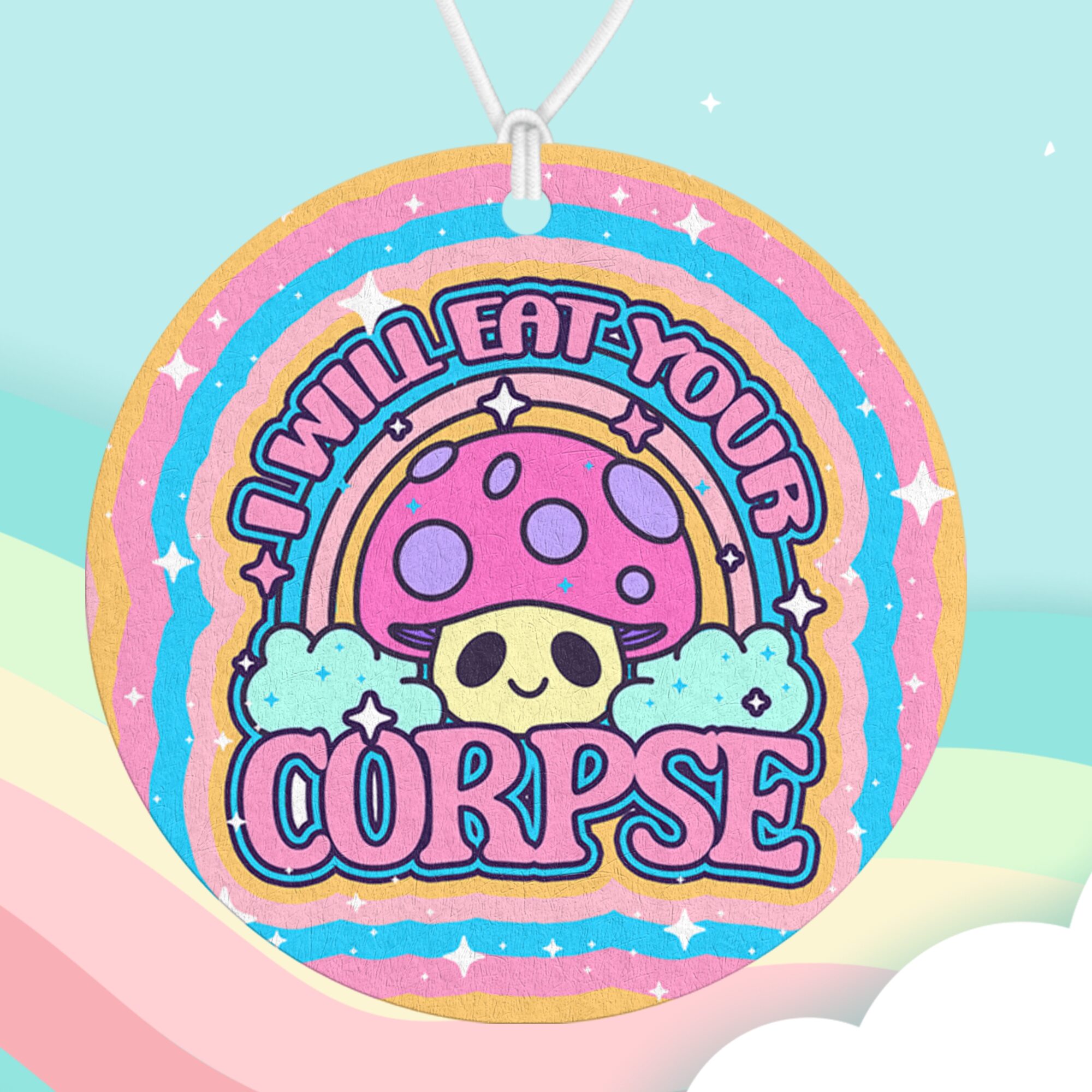Add a delightfully dark and whimsical touch to your space with the “I Will Eat Your Corpse Air Freshener.” Featuring a quirky little mushroom!