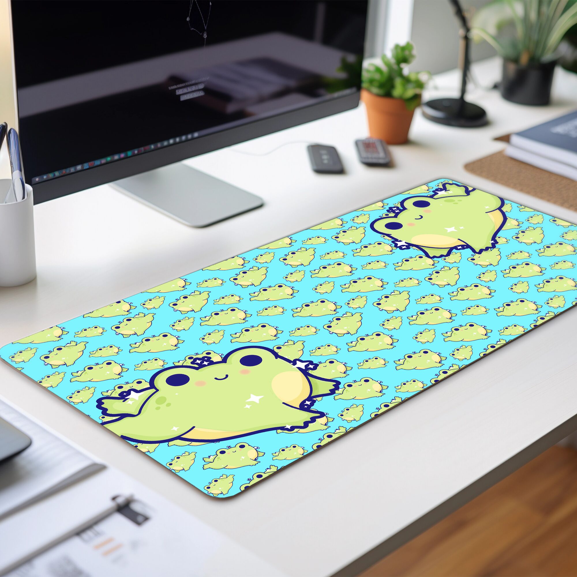 Perfect for long workdays or creative projects, the Leap Frog Deskmat adds an extra boost of fun and personality to your setup. The leaping frogs embody a carefree, spirited energy that might just inspire you to leap into your own tasks with a bit more enthusiasm 🌊. Available in two large sizes, it offers both comfort and style, making it a practical yet delightful way to personalize your desk. With its charming frog-filled design and bold colors, the Leap Frog Deskmat is a must-have for anyone who loves mixing functionality with a dash of playful magic.