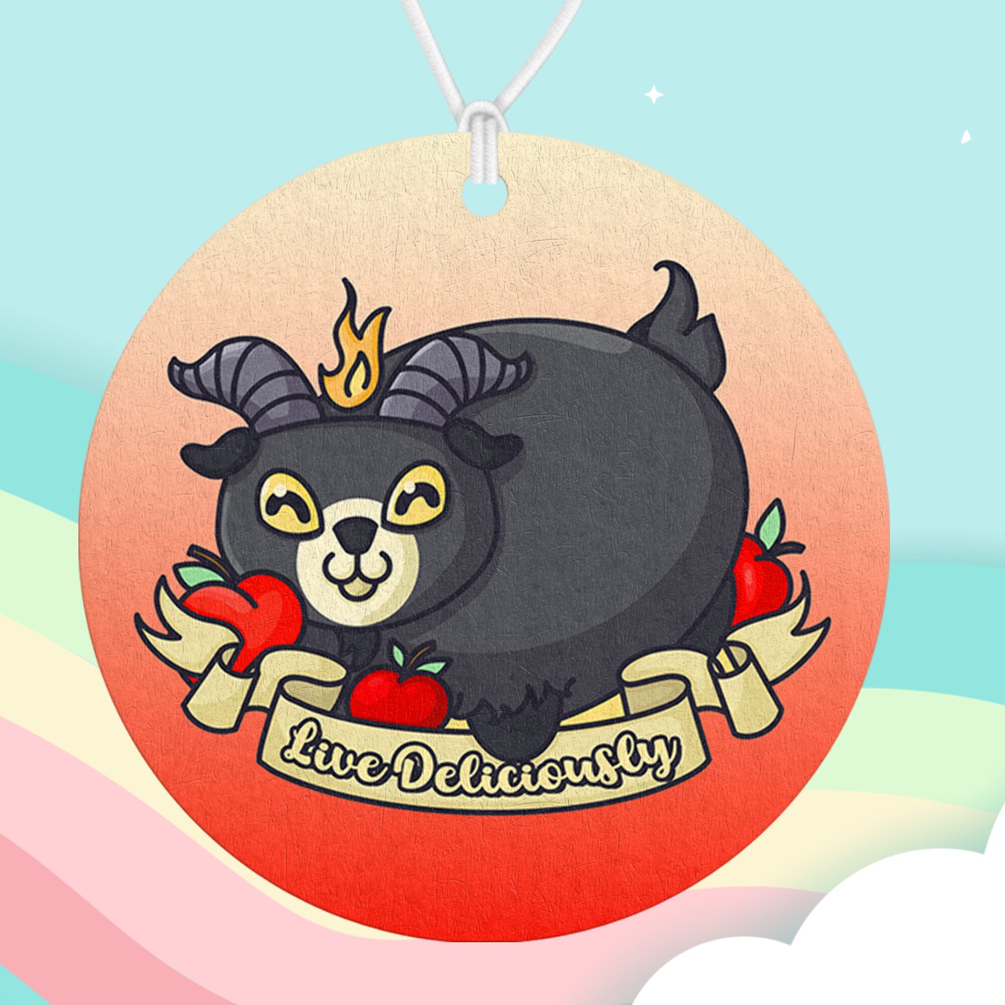 Each “Live Deliciously Air Freshener” is made in-house, showcasing exclusive Lil Charmery artwork you won’t find anywhere else. The black goat, with its cheeky expression and subtle mystical vibes, is designed to turn heads and spark conversation. The double-sided print ensures that the design looks just as good from either angle, giving you maximum charm and visibility no matter where you hang it. The phrase “Live Deliciously” adds a delightful twist, reminding you to embrace life’s indulgences, whether that’s a moment of self-care, your favorite snack, or simply surrounding yourself with things that make you smile.