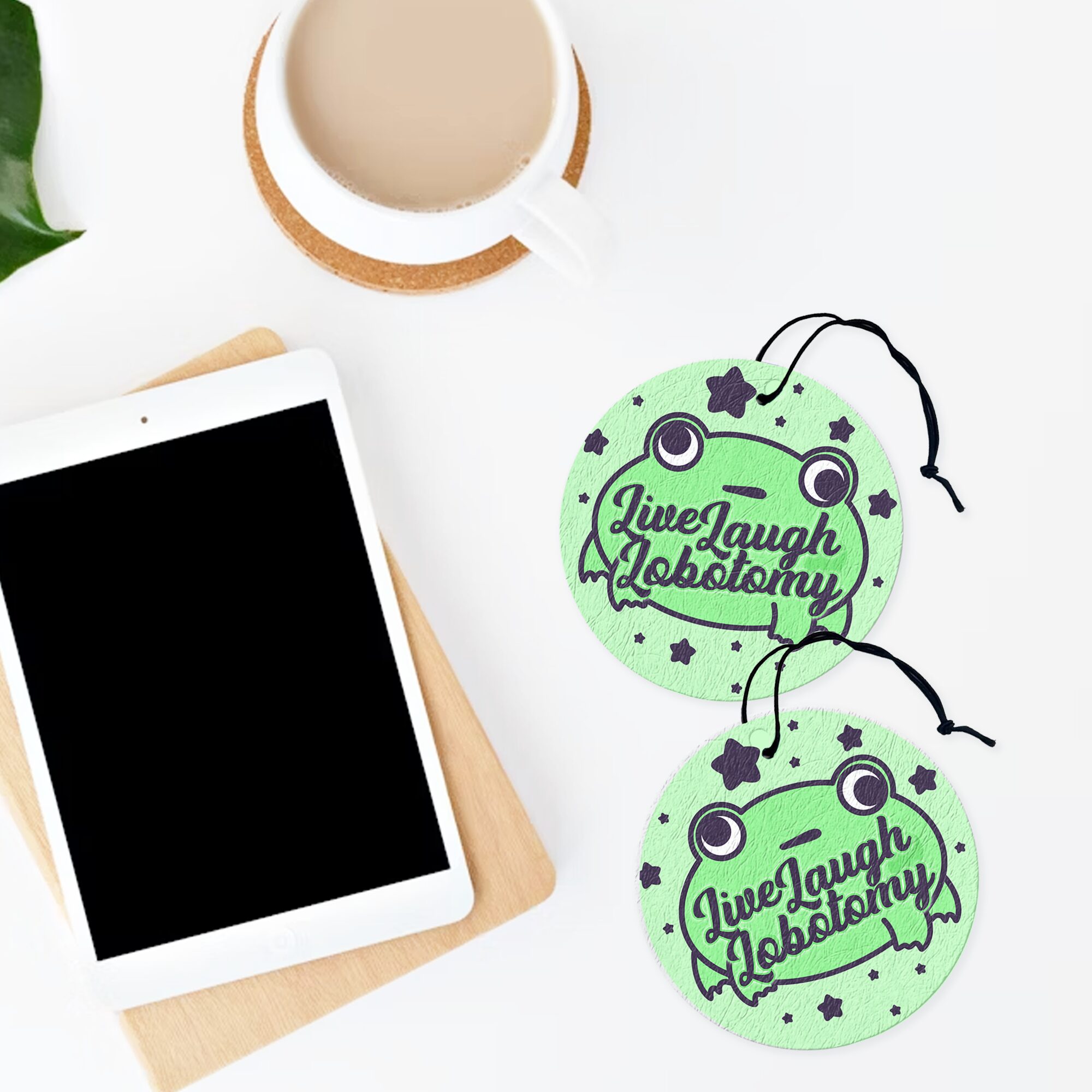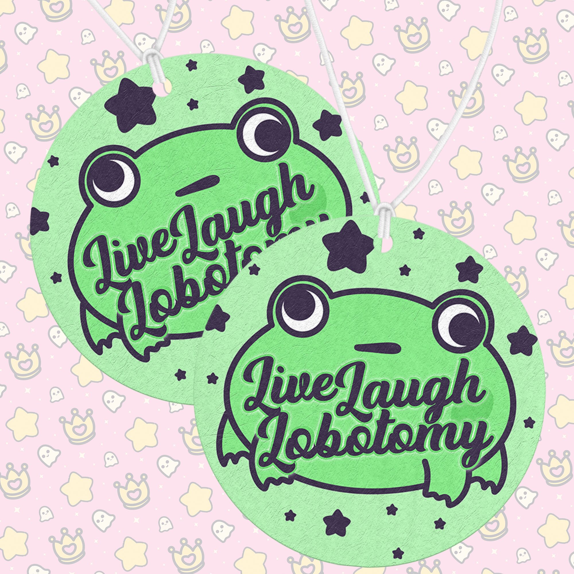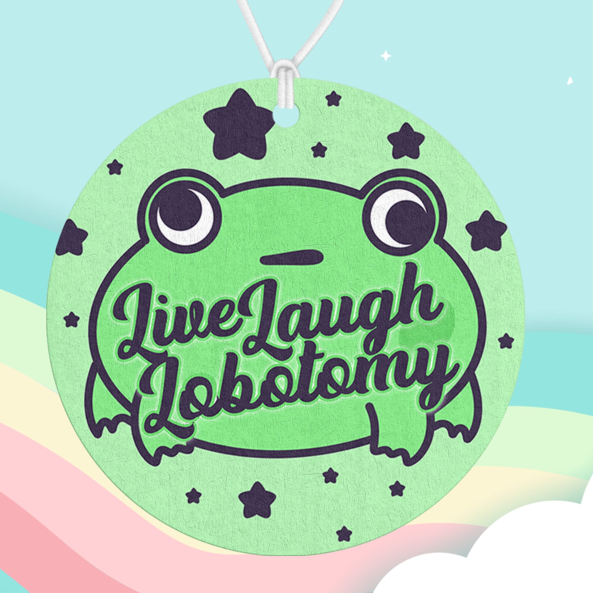 More than just a fragrance accessory, the “Live Laugh Lobotomy Air Freshener” is a statement piece. It’s the kind of thing that sparks conversation, makes people double-take, and adds a bit of bizarre joy to otherwise ordinary moments. The frog’s expression is both ridiculous and endearing, making it perfect for those who enjoy humor that’s a little unhinged but undeniably fun. 🌀💚