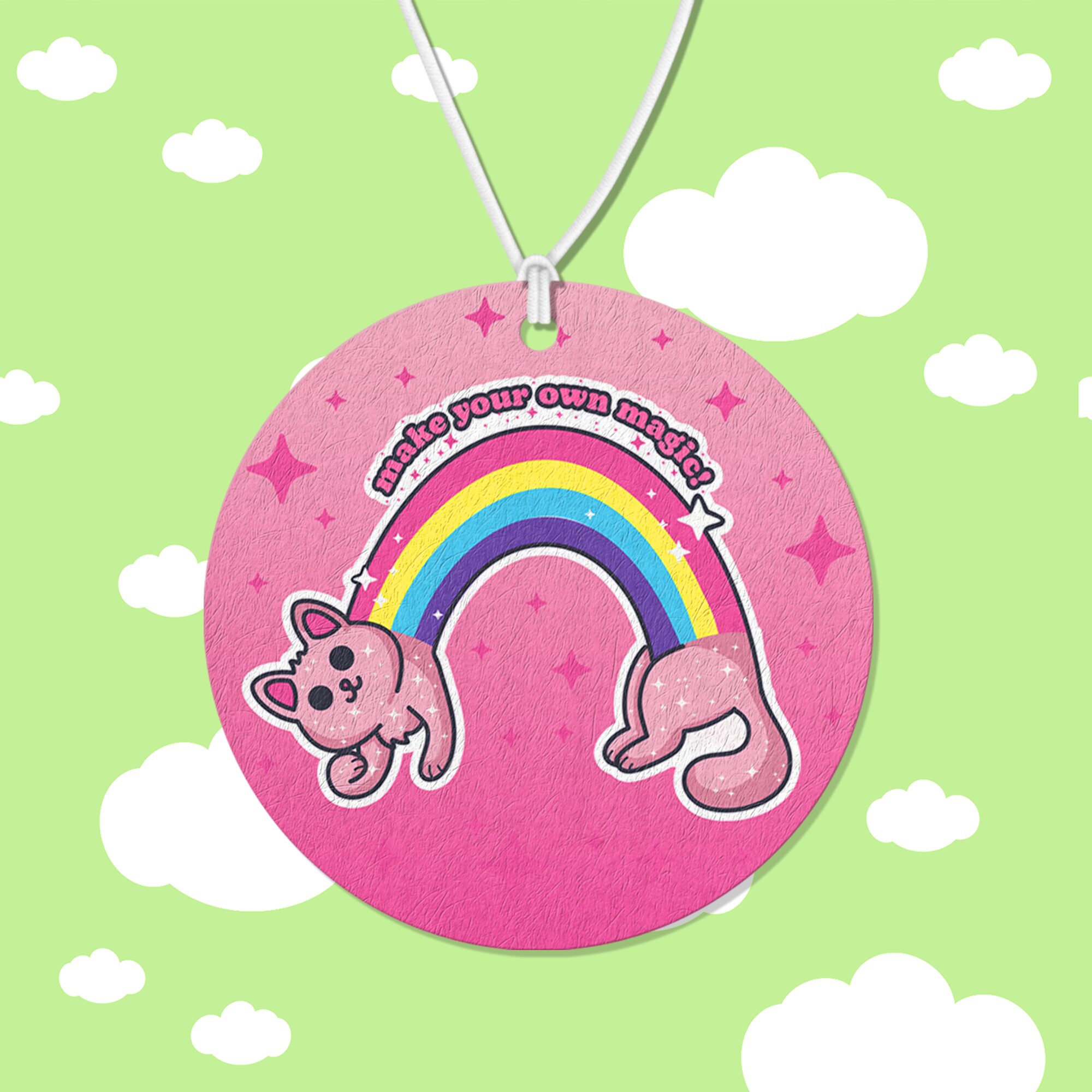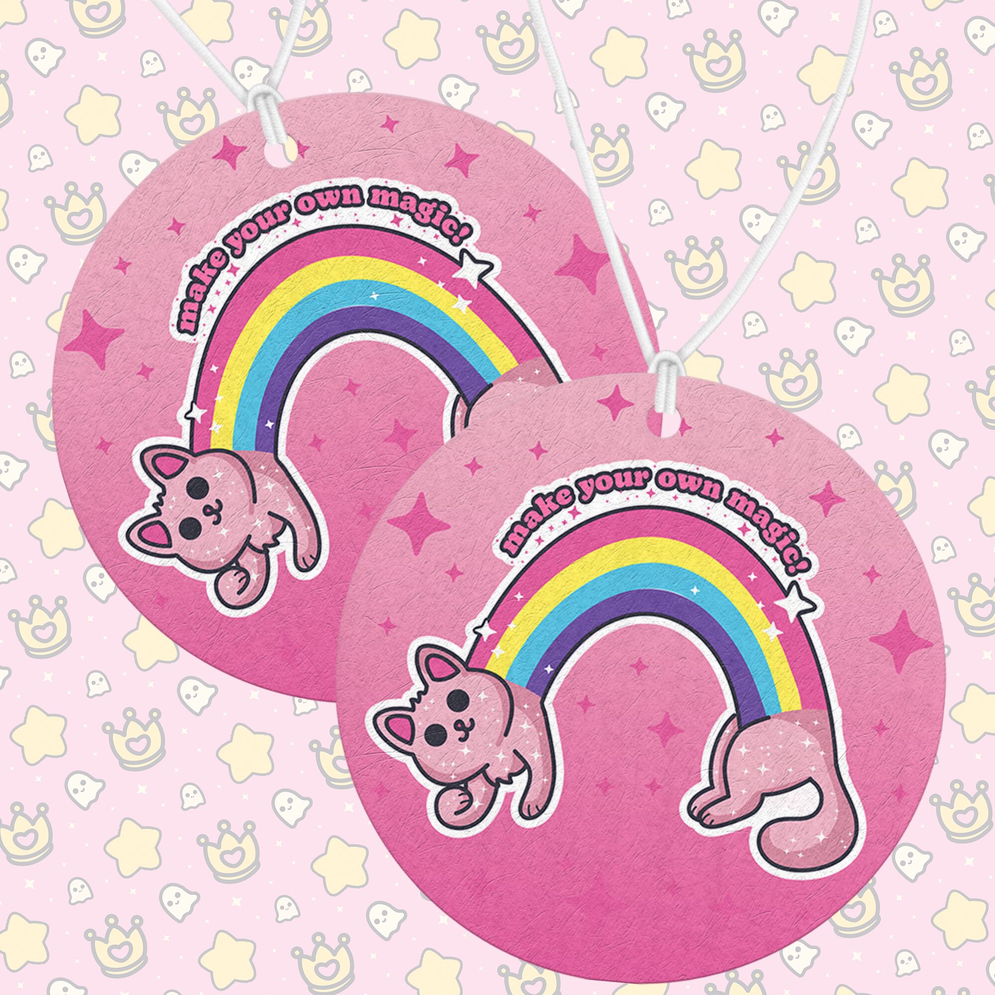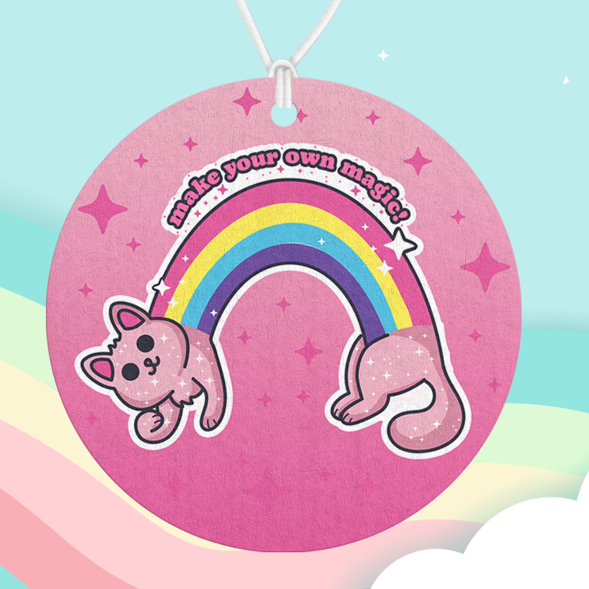 The “Make Your Own Magic Air Freshener” is a delightful little reminder that the magic you’re searching for is already inside you. Featuring a whimsical cat, its body stretched into a bright, rainbow arc, this design is both uplifting and enchanting. The cheerful phrase “Make Your Own Magic” ties it all together, encouraging you to embrace your unique spark and carry that positivity wherever you go. It’s the kind of artwork that feels playful and inspiring all at once, blending Lil Charmery’s signature quirky style with a touch of pure charm. 🌈
