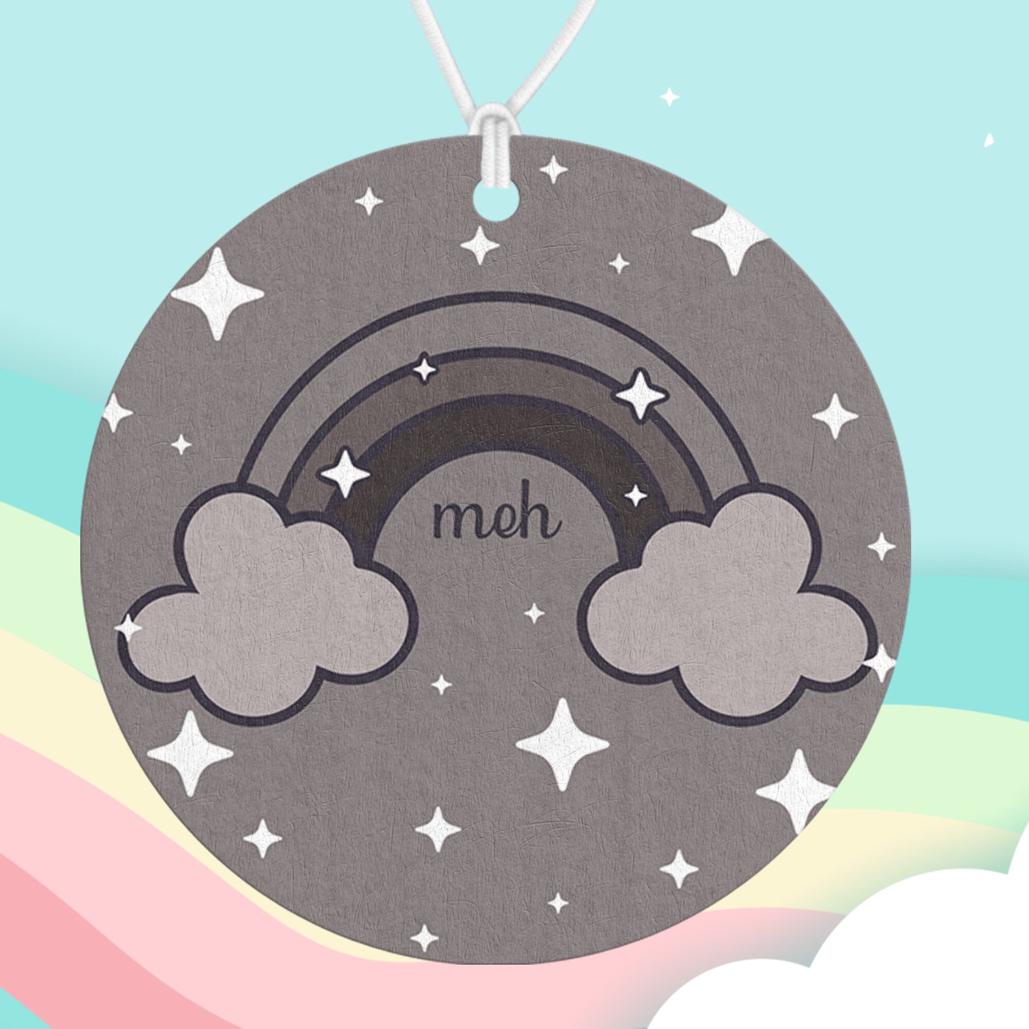 Sometimes life just doesn’t call for sunshine and sparkle, and that’s exactly what the “Meh Rainbow Air Freshener” was made to capture.