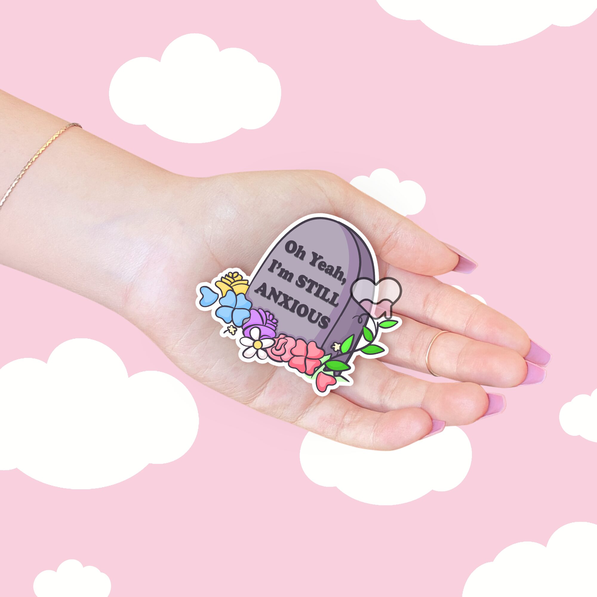The Oh Yeah Still Anxious Sticker is the perfect mix of dark humor and relatable realness, wrapped up in a playful design that speaks to anyone who knows what it’s like to carry around a little extra worry. Featuring a gravestone surrounded by delicate flowers with the phrase “Oh Yeah Still Anxious” carved right onto the stone, this sticker blends gothic charm with an honest, tongue-in-cheek message. It’s equal parts spooky and sweet, making it an eye-catching and conversation-starting addition to your collection. 🌸