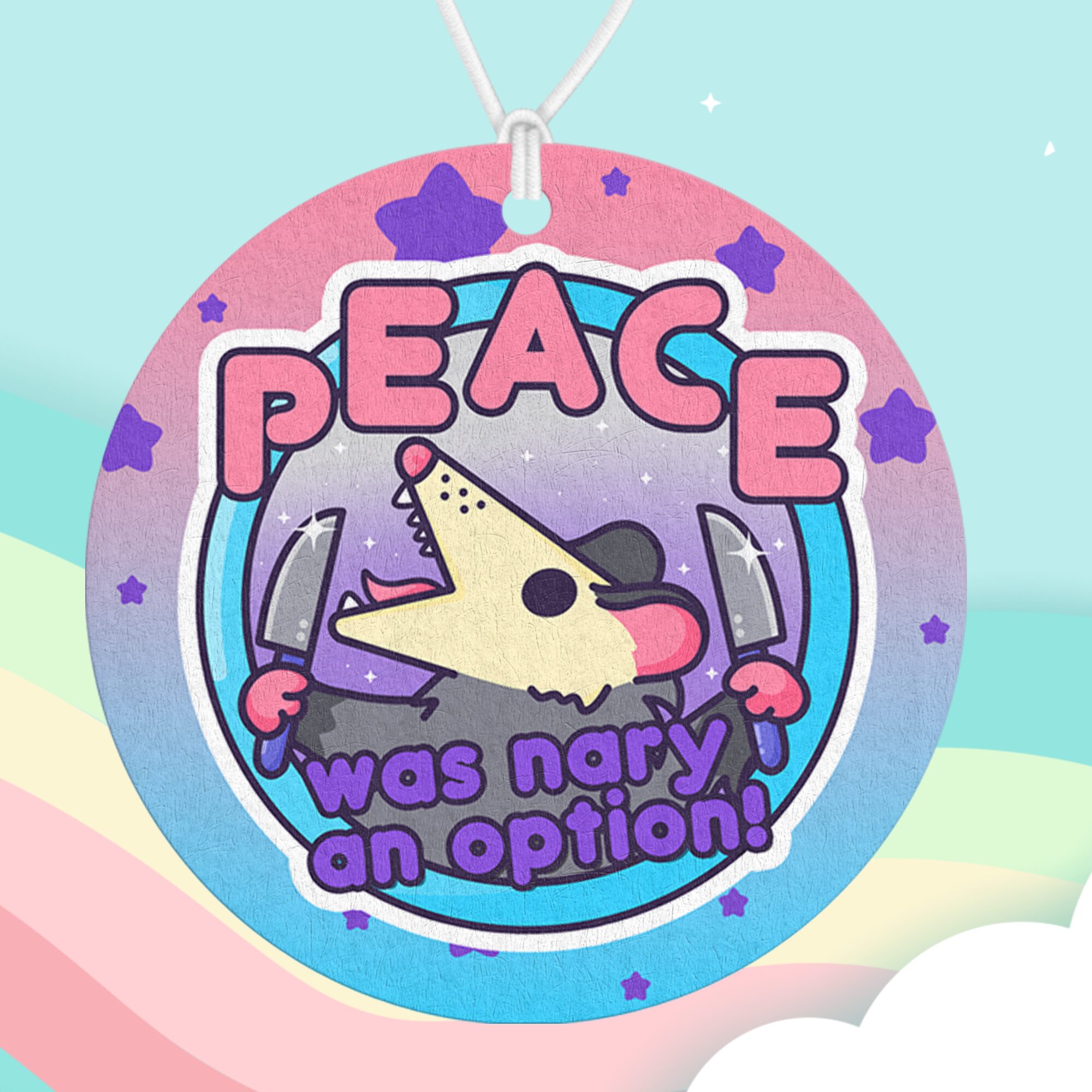 The “Peace Was Nary An Option Air Freshener” is a hilariously chaotic addition to your space, perfect for anyone who thrives on a little mischief and absurd humor. Featuring a cute yet screaming possum brandishing two tiny knives, this air freshener combines adorable artwork with an edgy, rebellious twist. The bold message “Peace Was Nary An Option” perfectly captures that feeling of playful anarchy, reminding us that sometimes life—and possums—just can’t be tamed. 🐾🔪