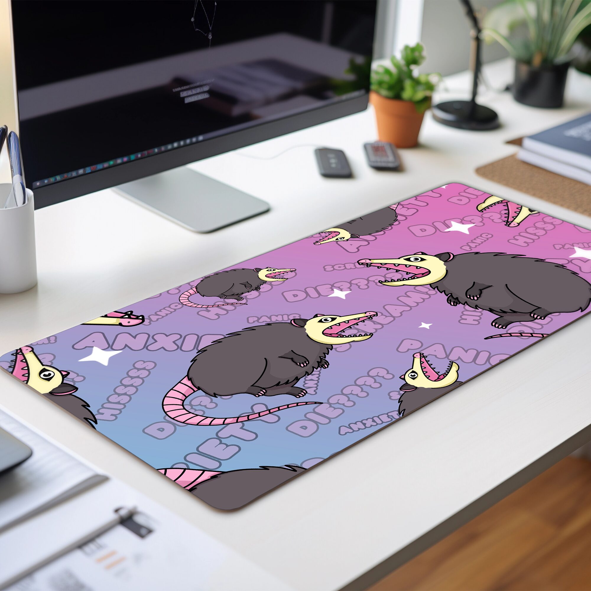 Made from soft neoprene, this deskmat provides a smooth and cushioned surface that feels as good as it looks. With its spacious size, it gives you plenty of room for your mouse and keyboard, allowing you to move freely while also keeping your setup neat. The repeating pattern of screaming possums paired with the vibrant pink and blue tones ensures that this deskmat never fades into the background—it’s bold, eye-catching, and full of personality. Every glance at the frantic little creatures is sure to bring a laugh, or at least a sense of solidarity when your day feels overwhelming.