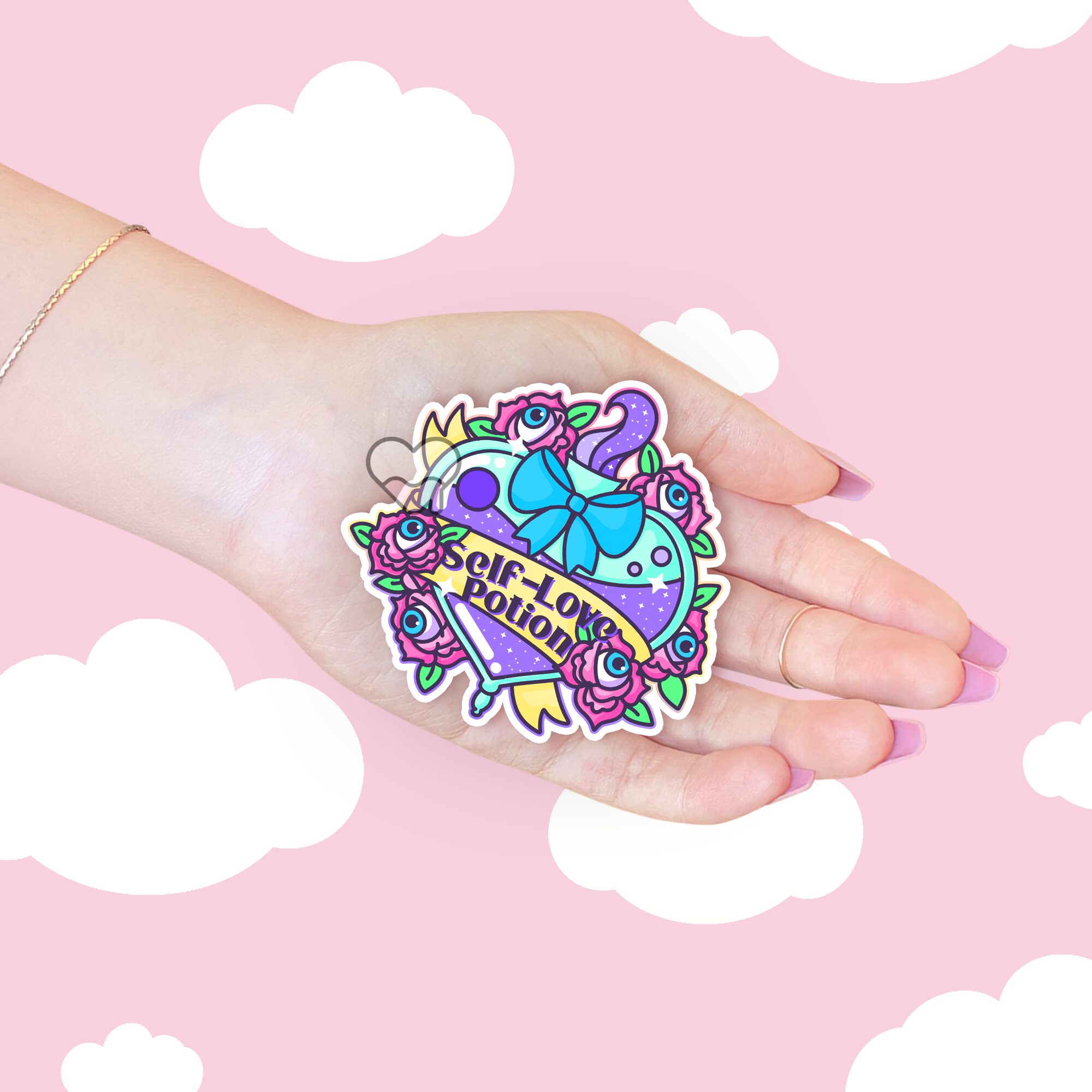 The Self Love Potion Sticker is a whimsical, enchanting little reminder that magic begins within yourself. Featuring a beautifully designed potion bottle adorned with roses, each bloom hiding a mysterious little eyeball at its center, this sticker is both playful and thought-provoking. The words “Self Love Potion” flow across the design, tying it all together with a message that feels equal parts mystical and empowering. It’s not just a cute accessory—it’s a statement about the importance of honoring yourself, quirks and all. 🌹