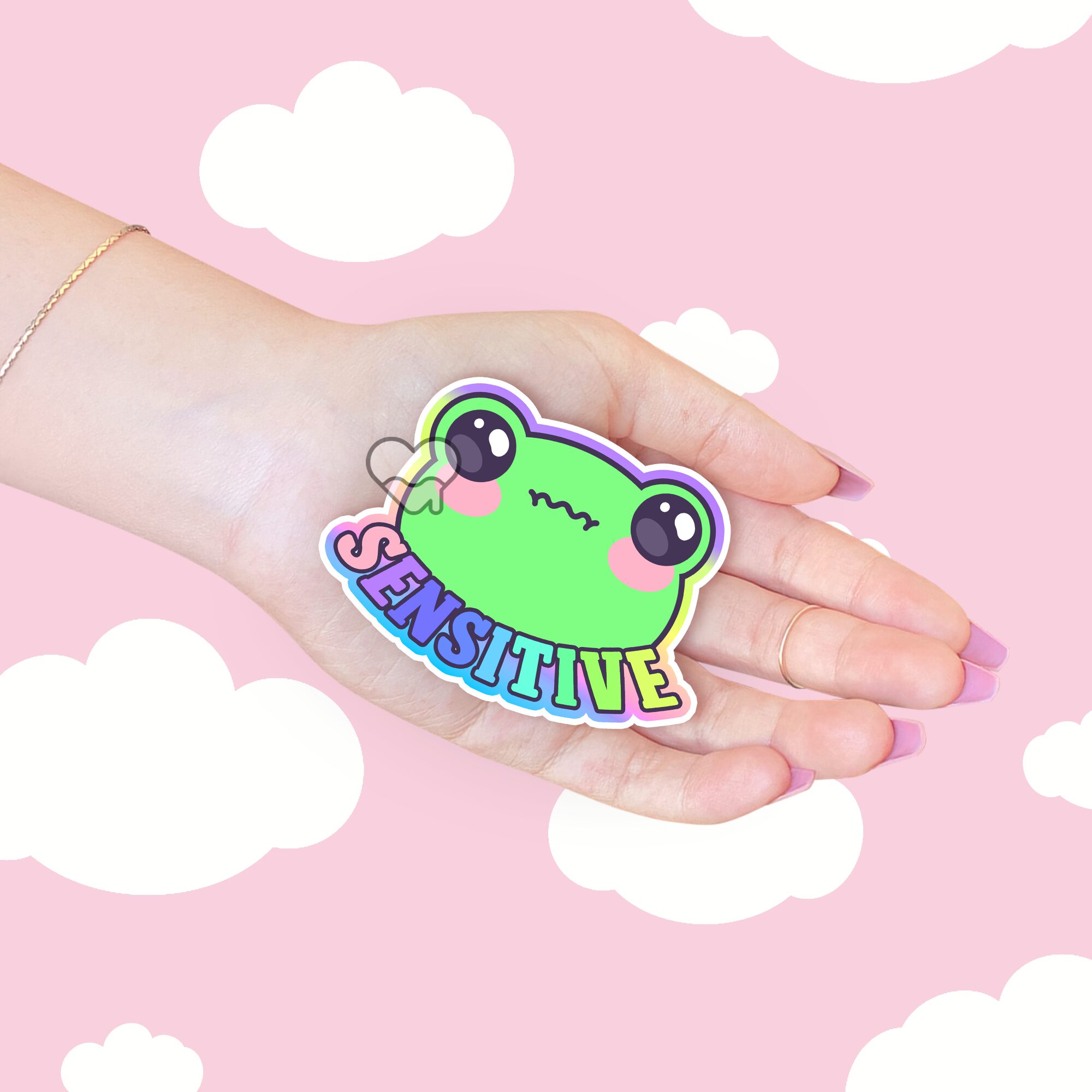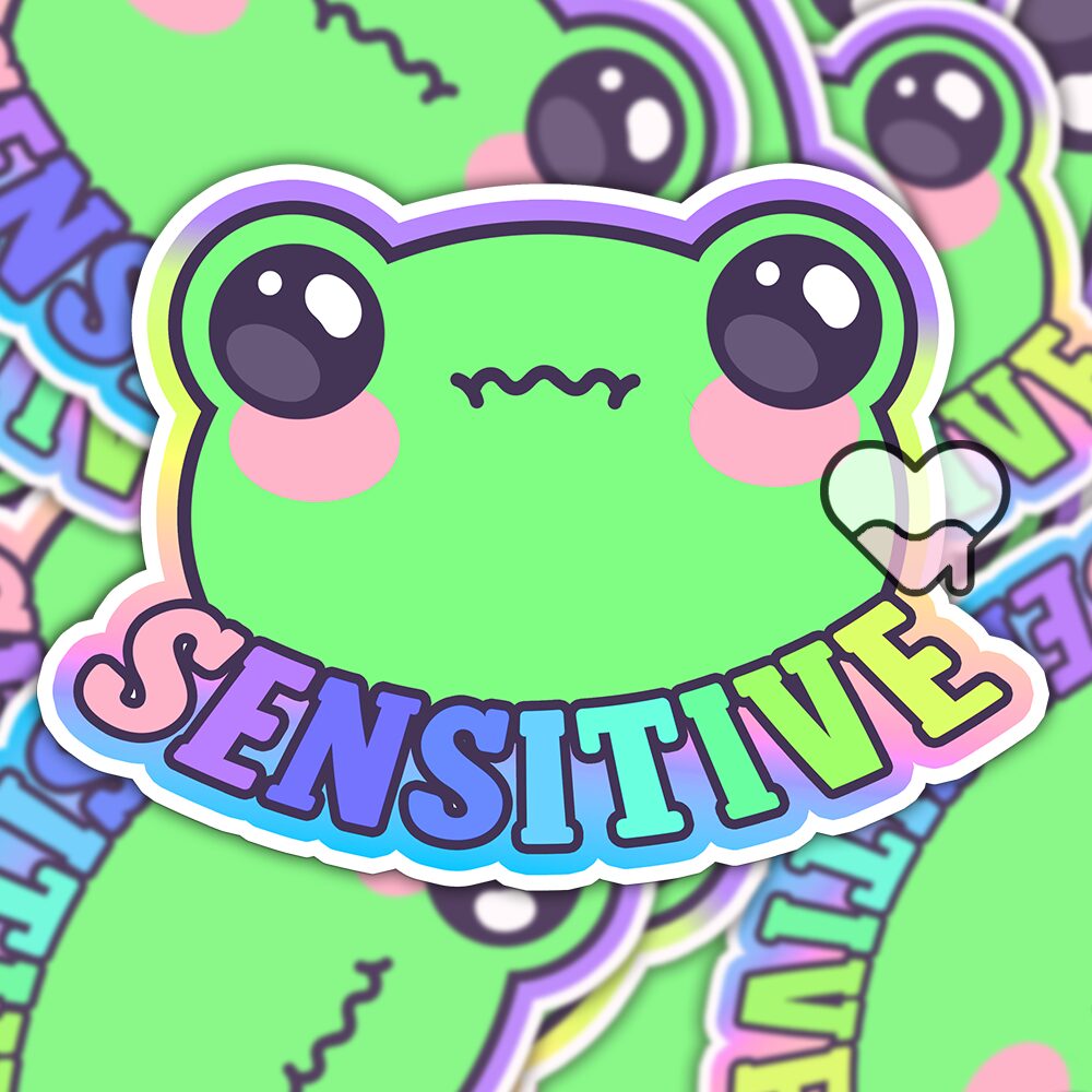 The Sensitive Frog Sticker is a tender little tribute to all the soft hearts out there. Featuring an adorable green frog with big, watery eyes and the word “Sensitive” written beneath, this design captures the beauty of wearing your emotions openly. It’s cute, heartfelt, and a little bit vulnerable, just like the moments when we feel everything deeply. 🐸