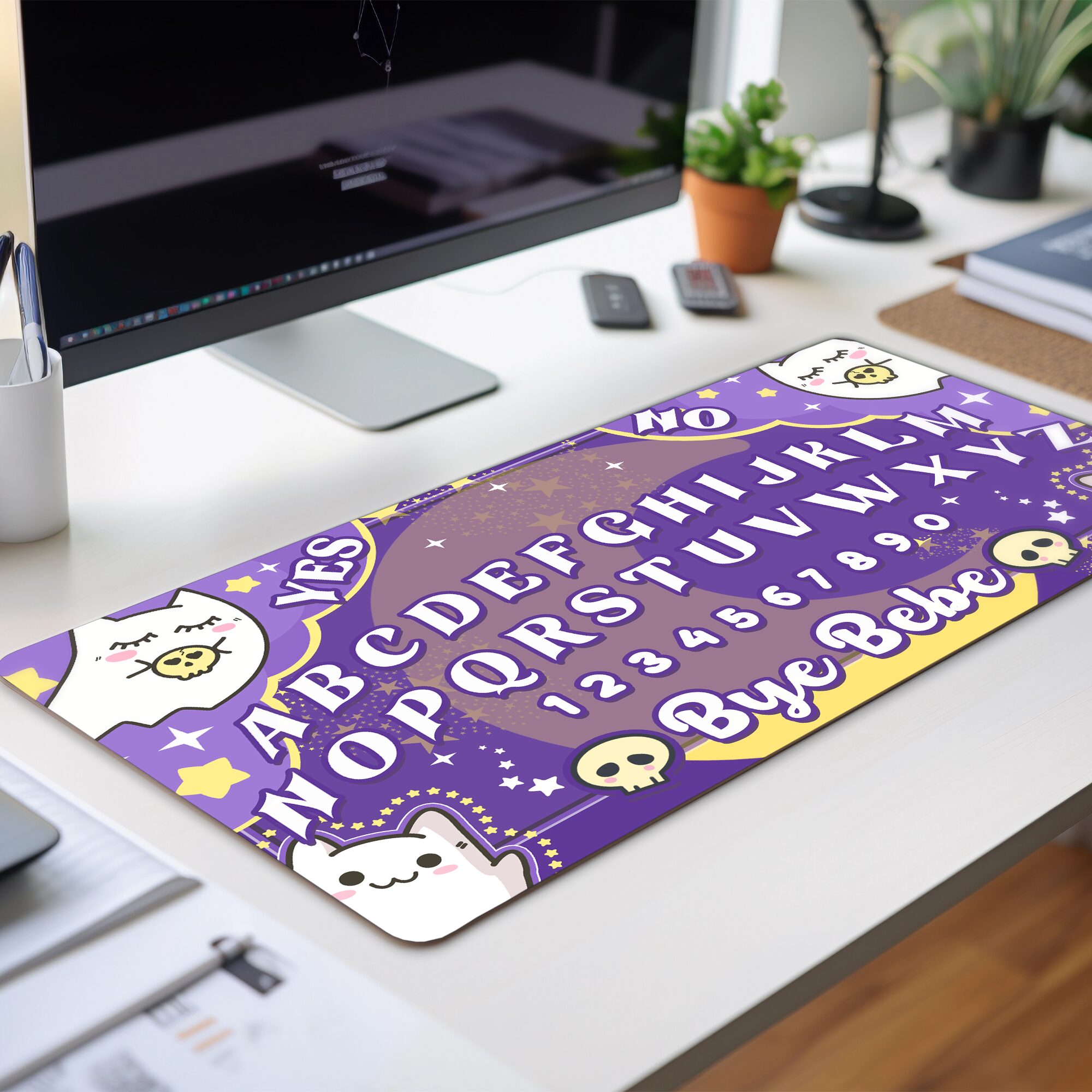 The Sweet Kitties Ouija Deskmat is a charming blend of spooky and adorable, designed to bring a playful twist of the supernatural to your desk. Featuring a whimsical ouija board adorned with sweet little ghost kitties, this deskmat takes the mysterious and makes it cute. The spectral cats float across the board like they’re guiding you through the spirit realm, but instead of chills and fear, they bring a sense of warmth and fun. It’s the kind of design that’s both magical and lighthearted, making it perfect for cat lovers who also enjoy a touch of the mystical 🐱.