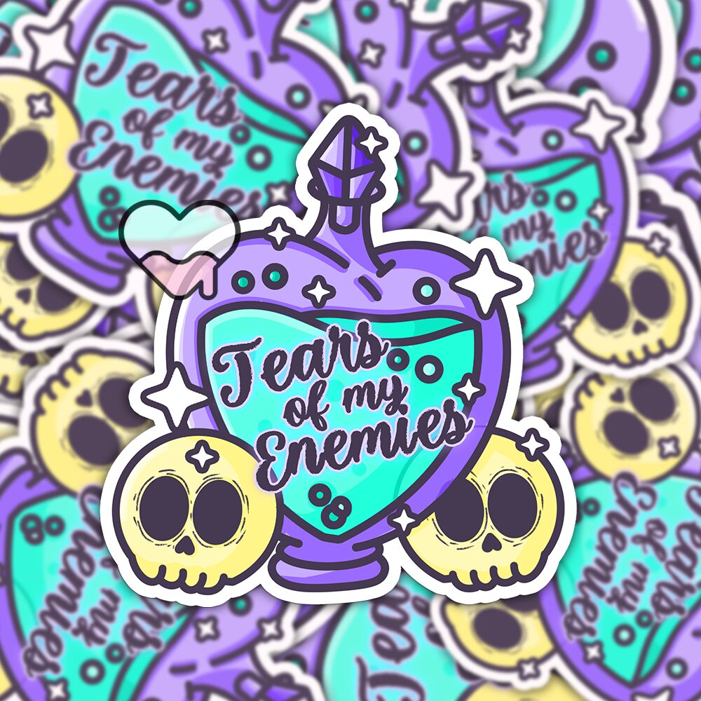 The Tears Of My Enemies Sticker is the perfect mix of sass, magic, and dark humor all bottled up into one striking design. Featuring a detailed potion bottle filled with shimmering “tears” and framed by little skulls on the side, this sticker is made for anyone who loves playful gothic aesthetics with a touch of whimsy. The phrase “Tears of My Enemies” adds just the right amount of attitude, making it a bold and unforgettable piece to add to your sticker collection. 💀✨