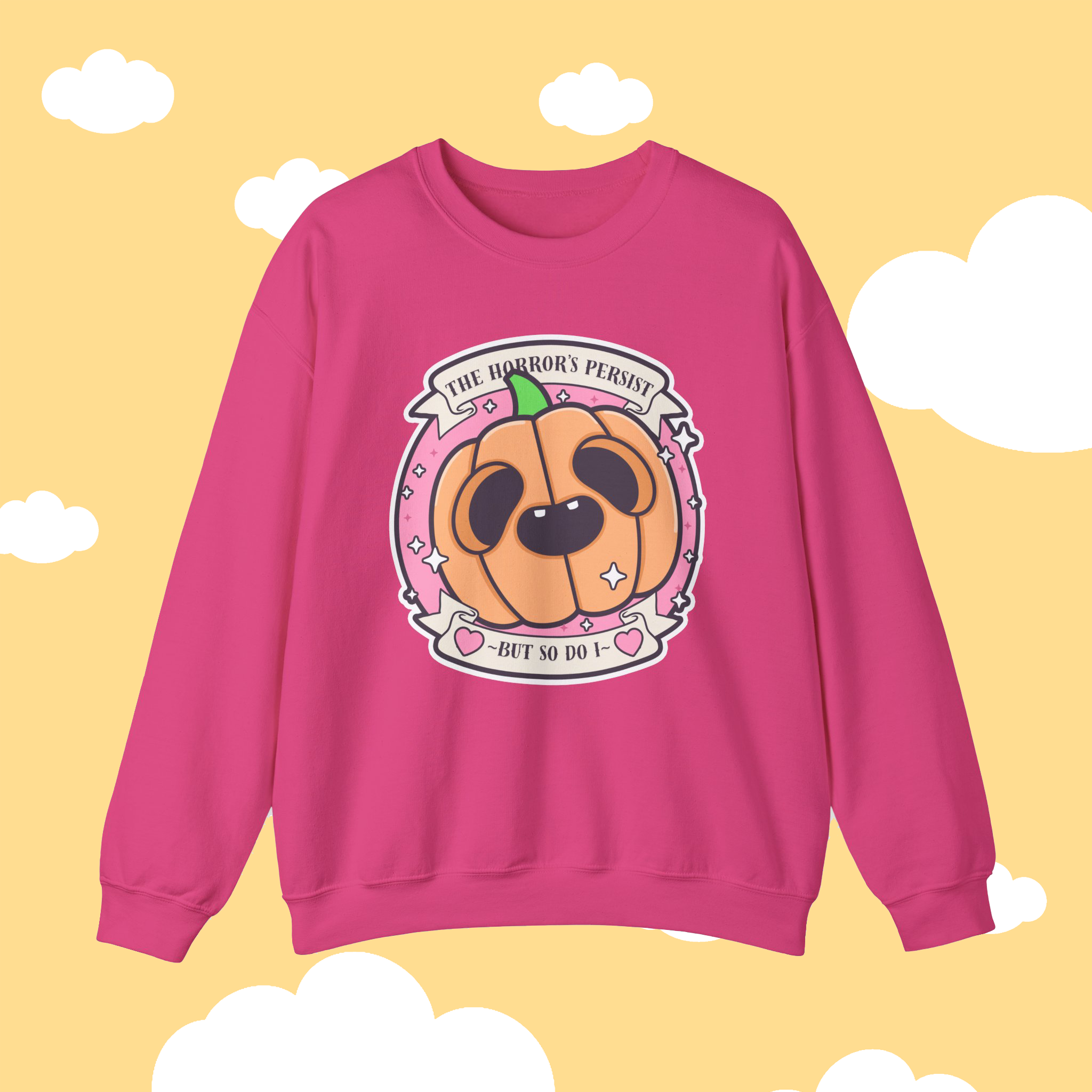 The The Horrors Persist But So Do I Pumpkin Sweatshirt is the perfect blend of humor, resilience, and cozy fall fashion. Featuring an adorably goofy one-toothed pumpkin alongside the phrase “The Horrors Persist But So Do I”, this sweatshirt is for anyone who knows how to laugh through life’s chaos and keep going no matter what. With its mix of spooky charm and witty commentary, it’s not just a sweatshirt—it’s a mood, a mantra, and a little reminder that persistence is its own kind of magic 🎃💀.