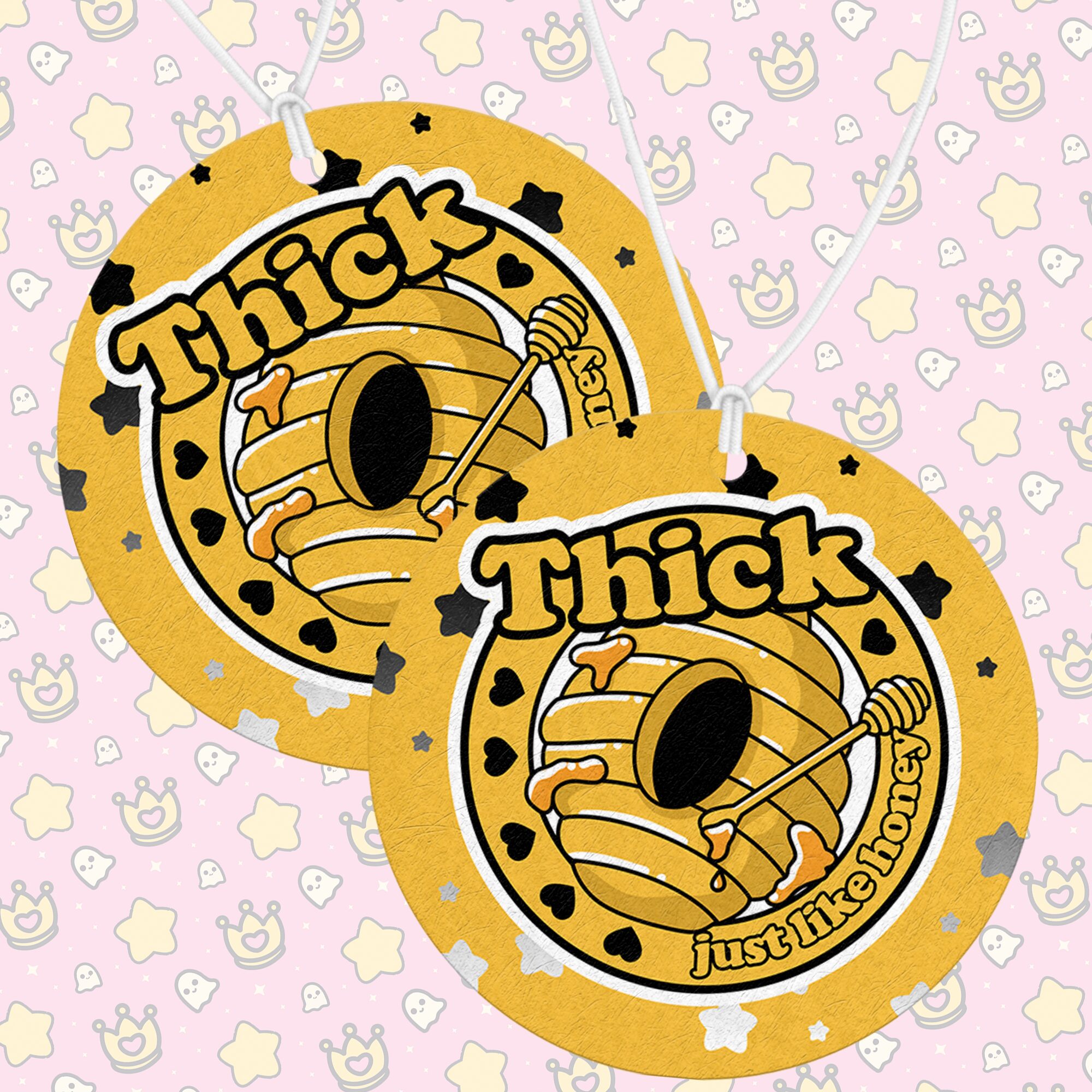 The “Thick Like Honey Air Freshener” is a sweet and playful design that captures the richness and charm of a hive dripping with golden honey.