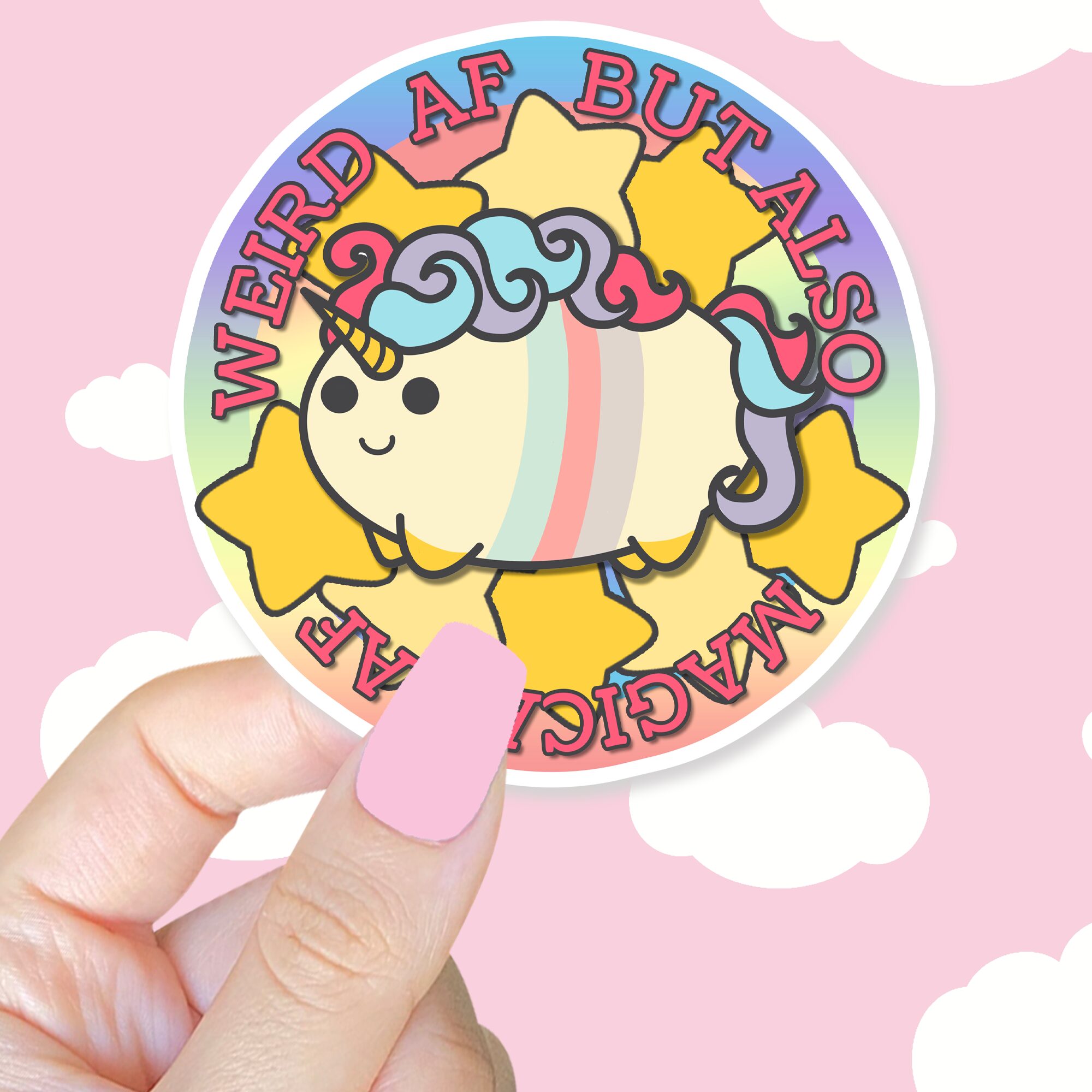 The Weird AF Magical AF Sticker is all about embracing your quirks and celebrating the fact that being a little different is what makes life so much more exciting. Featuring a funky-looking unicorn with plenty of personality, this sticker is a bold reminder that weird and magical often go hand in hand. It doesn’t try to fit into a box—instead, it stands out proudly, just like you. With its fun design and playful phrase, “Weird AF Magical AF,” this sticker radiates good vibes and unapologetic individuality. 🦄