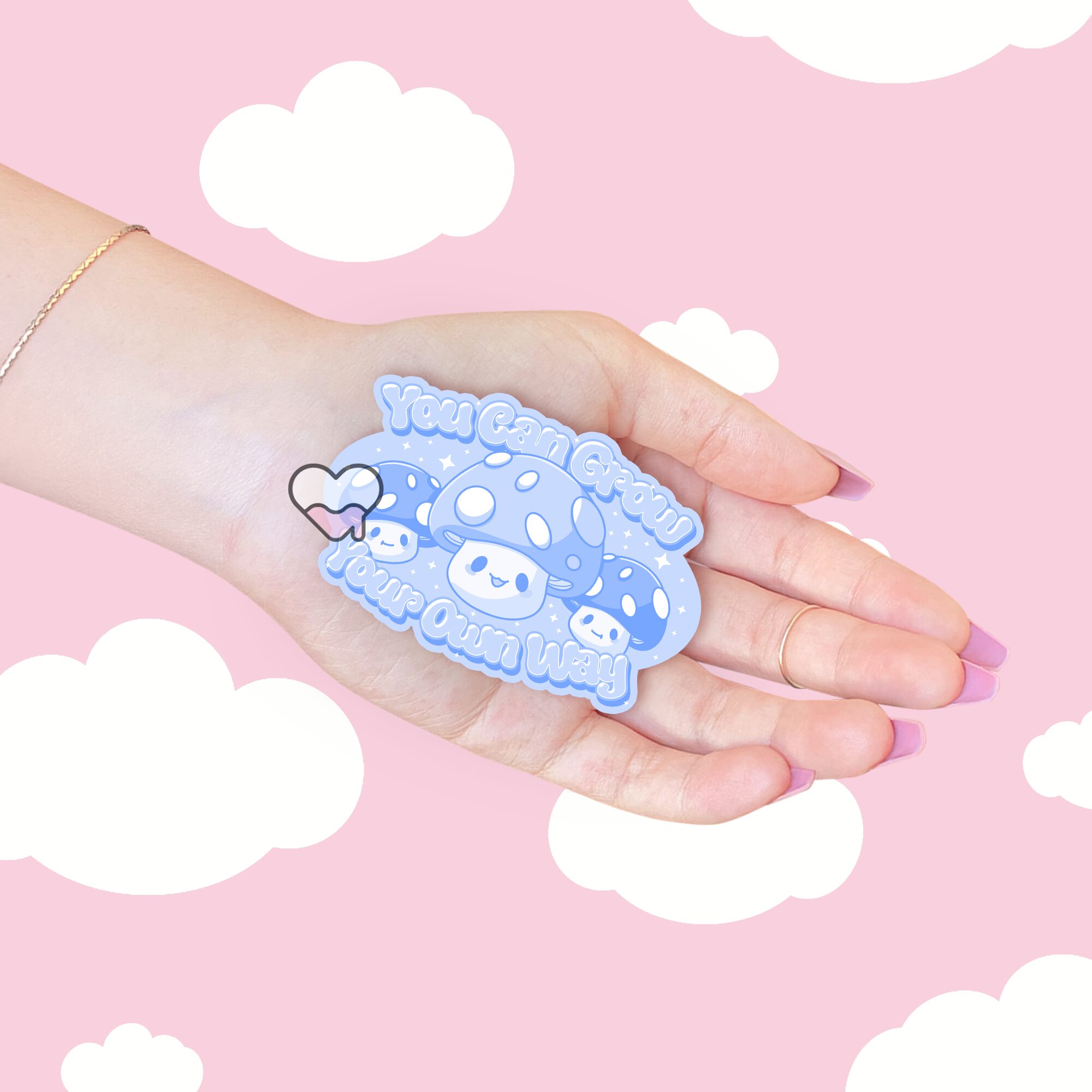 The You Can Grow Your Own Way Blue Sticker is a gentle yet powerful reminder that your growth doesn’t have to look like anyone else’s. Featuring three darling mushrooms shaded in a soft, dreamy blue, this sticker combines charm, whimsy, and encouragement in a way that feels comforting every time you look at it. The phrase “You Can Grow Your Own Way” is printed clearly alongside the artwork, serving as both an affirmation and a little push toward embracing your individuality 🌱.